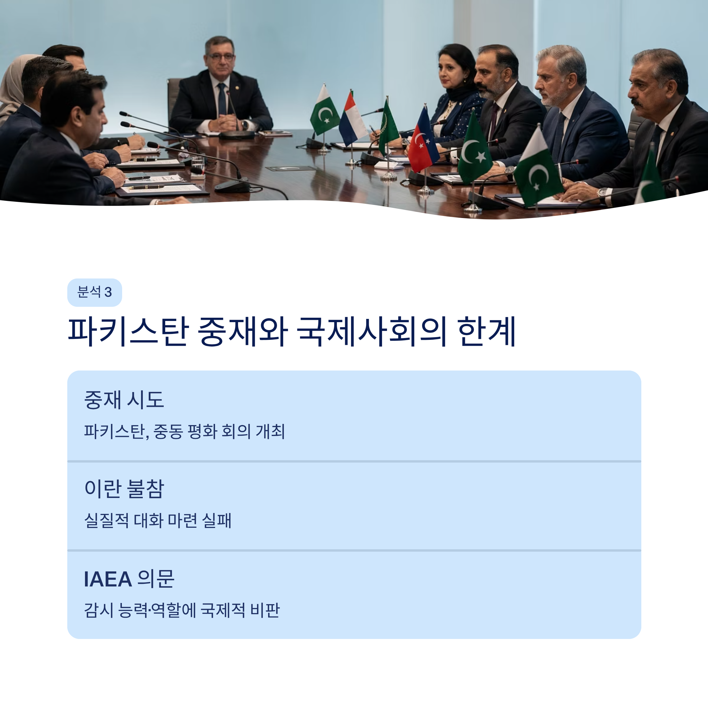 | 국제사회 | 파키스탄 주도의 평화 회의 등 중재 노력이 진행 중이나 뚜렷한 성과는 없는 상황입니다. 국제 원자력 기구(IAEA)의 역할과 감시 능력에 대한 의문과 비판이 제기되고 있습니다. |