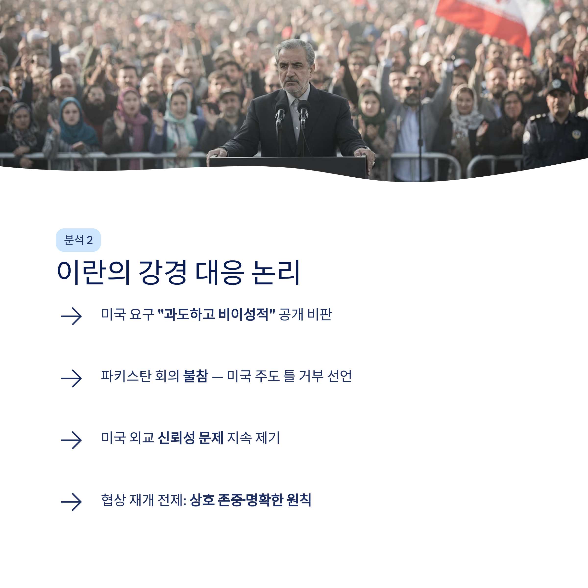 | 이란 | 파키스탄 주도 회의에 불참하며 미국과 직접 협상한 바 없다고 단언했습니다. 미국의 요구사항이 과도하고 비이성적이라 비판하며, 미국 외교의 신뢰성 문제를 제기하고 협상 원칙을 강조했습니다. |