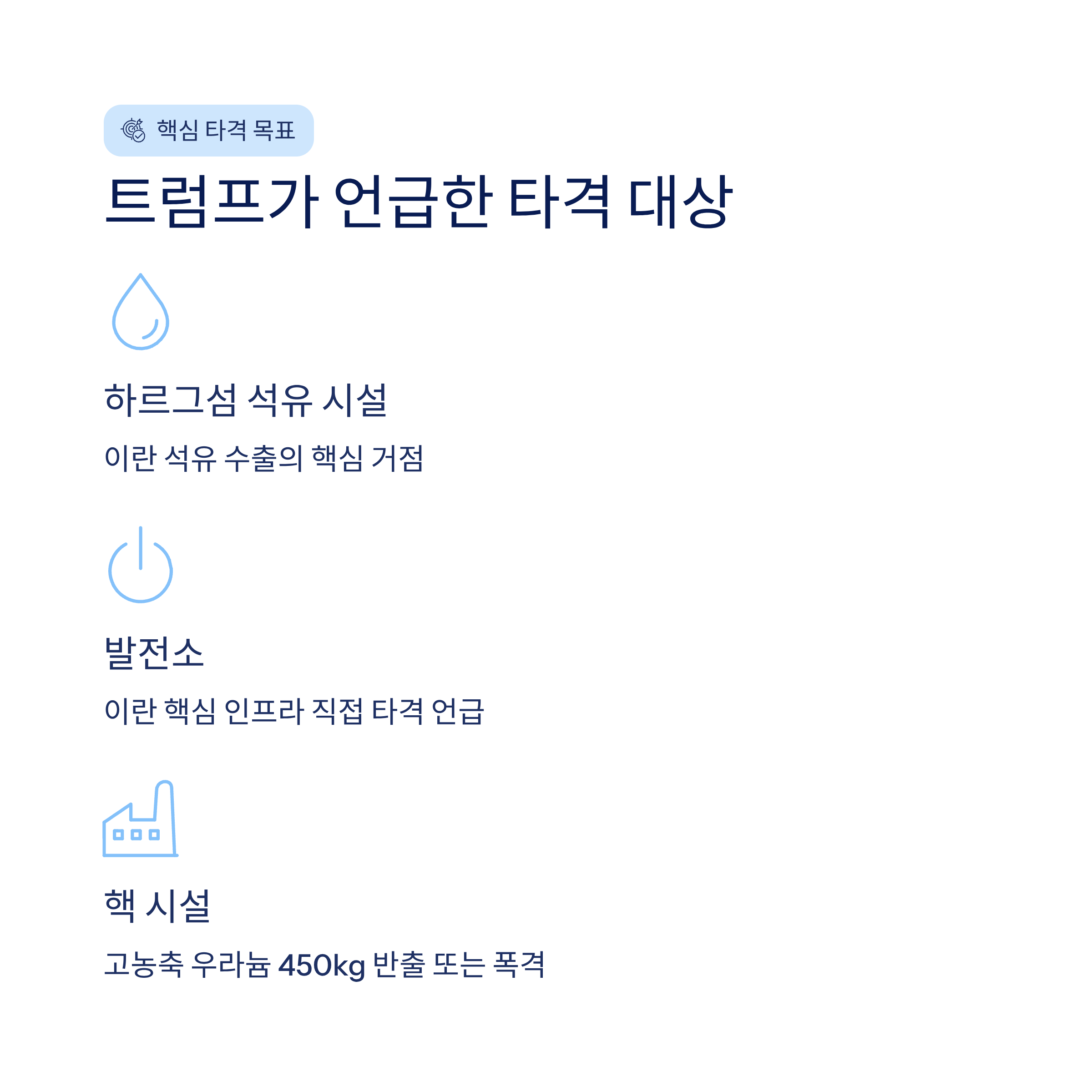 이란의 고농축 우라늄 450kg 반출 요구 및 협상 결렬 시 군사적 행동 가능성을 강하게 시사했습니다. 이란의 핵심 인프라(발전소, 석유시설) 타격을 구체적으로 언급하며 해병 기동 부대 등 군사적 준비를 완료했다고 밝혔습니다. |