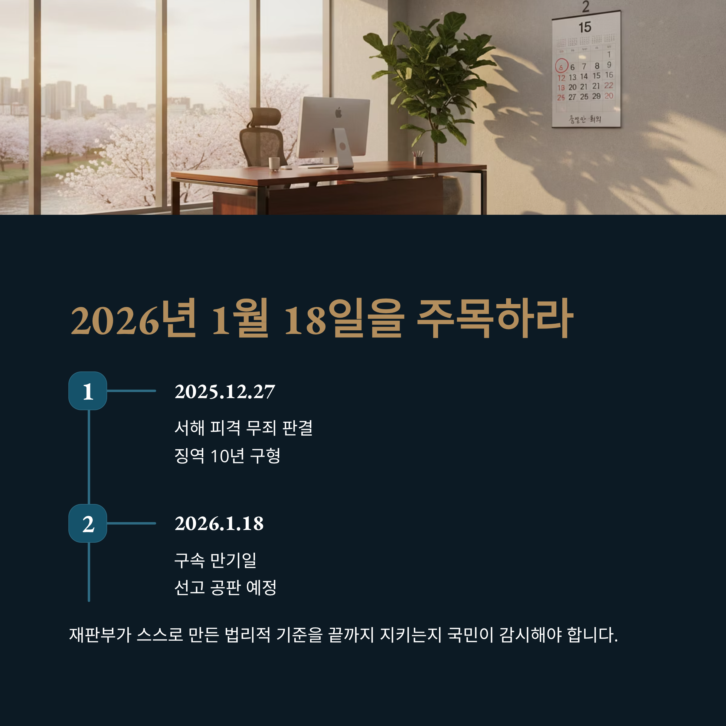 특검의 징역 10년 구형은 법리적 근거가 빈약한 정치적 쇼에 불과합니다. 이제 공은 다시 지귀연 판사에게 넘어갔습니다. 본인이 작성한 판결문의 잉크가 마르기도 전에, 동일한 법리를 윤 전 대통령에게 적용하지 않는다면 그것은 판사가 아닌 특정 진영의 하수인임을 자인하는 꼴이 될 것입니다. 오는 2026년 1월 18일 구속 만기일에 있을 선고 공판까지, 우리 국민은 재판부가 스스로 만든 법리적 기준을 끝까지 지키는지 두 눈 부릅뜨고 감시해야 합니다. 사법 정의가 살아있다면 결론은 당연히 '무죄'여야 합니다.