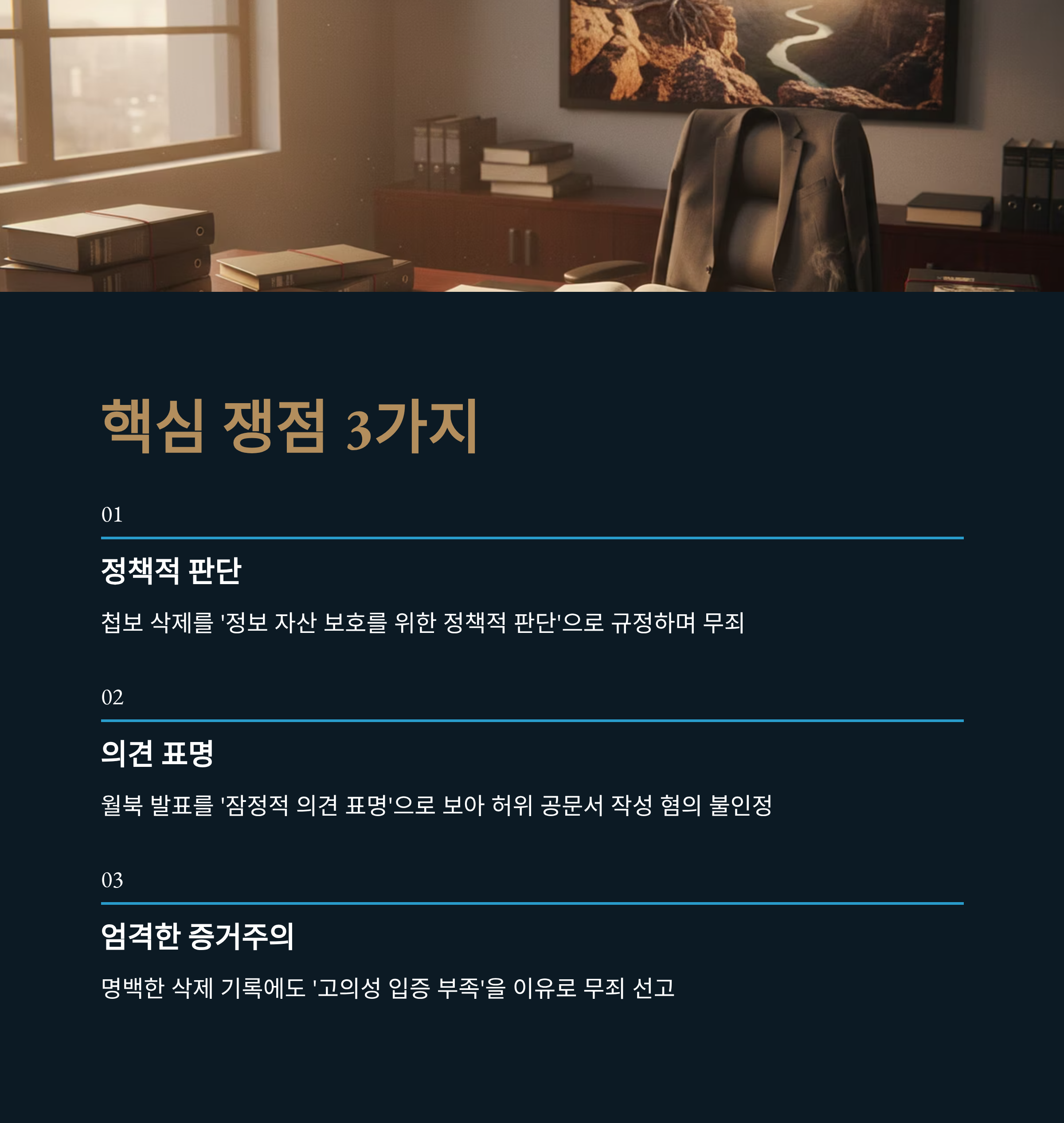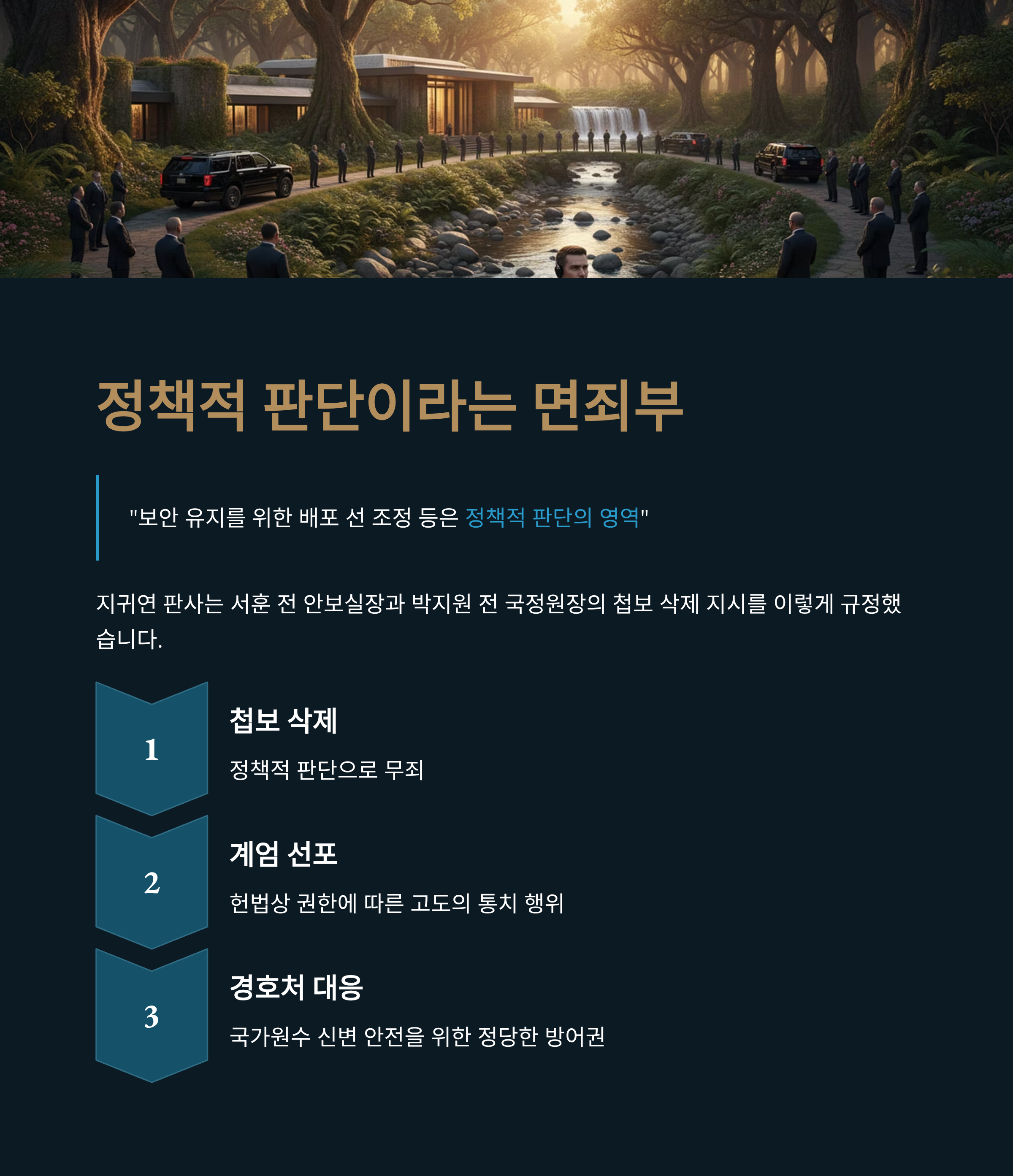 첫째, 재판부는 첩보 삭제 지시를 '정보 자산 보호를 위한 정책적 판단'으로 규정하며 무죄를 선고했습니다. 이 논리는 윤 전 대통령의 계엄 선포와 경호처의 대응 역시 국가 안위를 위한 고도의 통치 행위로 해석될 여지를 제공합니다.