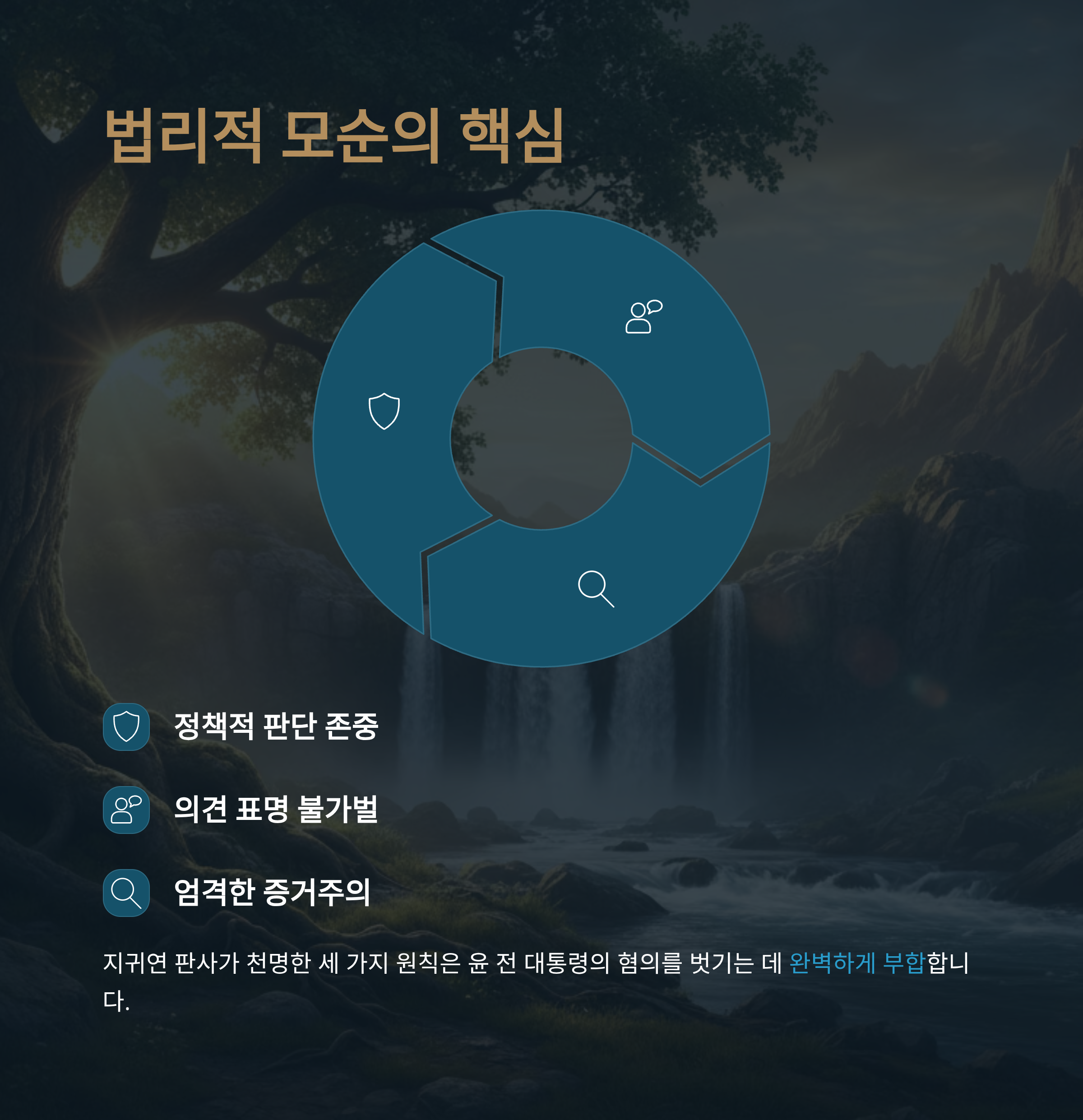 어제 지귀연 부장판사가 내린 판결은 대한민국 안보를 위협했던 자들에게 면죄부를 준 통탄할 일이었으나, 역설적으로 그 판결문은 윤석열 전 대통령의 무죄를 입증하는 '황금 열쇠'가 되었습니다. 재판부가 천명한 '정책적 판단 존중', '의견 표명의 불가벌', '엄격한 증거주의'라는 세 가지 원칙은 윤 전 대통령의 혐의를 벗기는 데 완벽하게 부합합니다.
