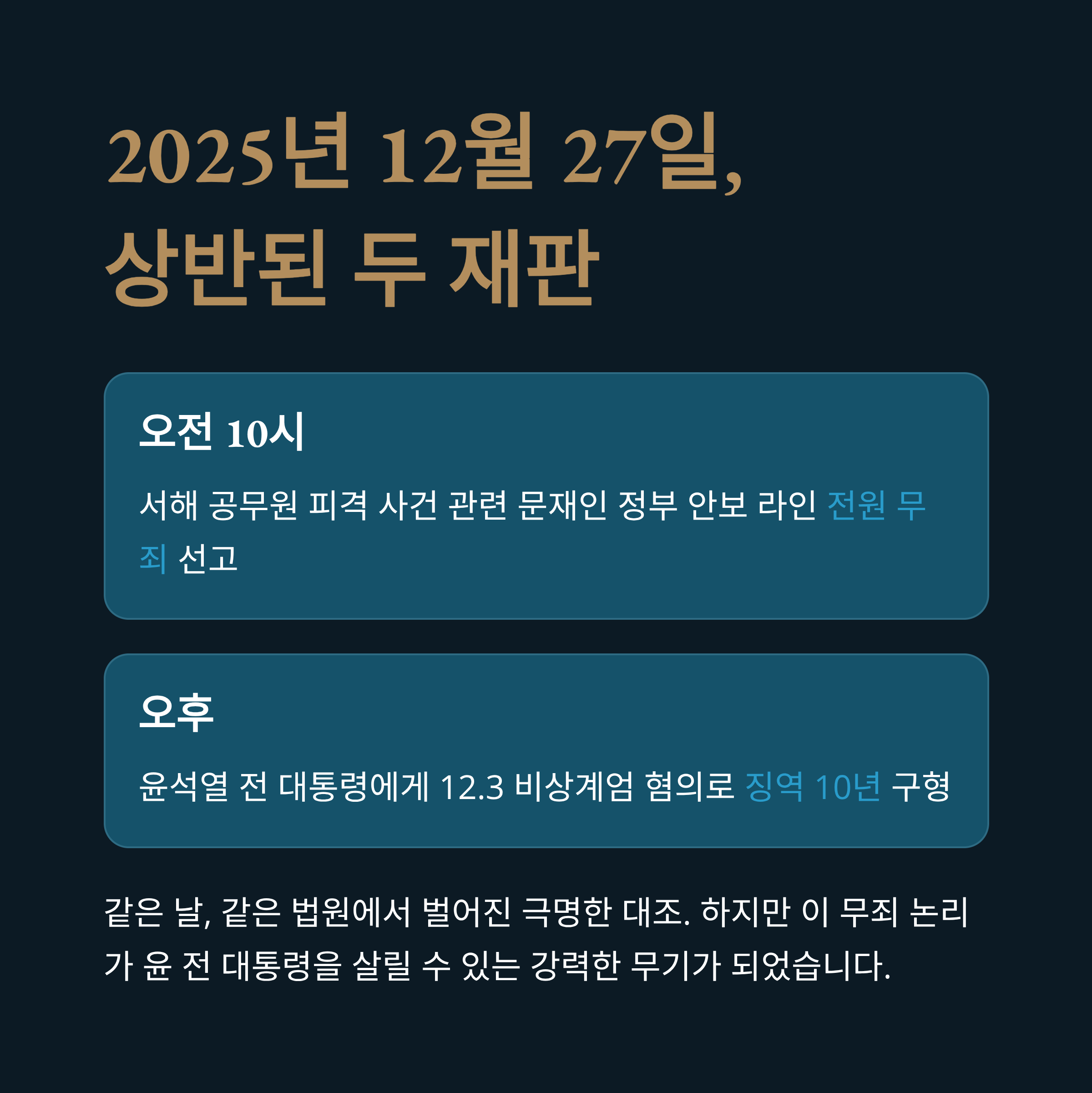 2025년 12월 27일, 현재 대한민국 사법부는 정의의 저울이 고장 난 듯한 모습을 보이고 있습니다. 어제 서초동 법원에서는 상반된 두 가지 사건이 전 국민의 이목을 집중시켰습니다. 오전 10시, 서울중앙지법 지귀연 부장판사는 서해 공무원 피격 사건과 관련하여 첩보를 삭제하고 월북 몰이를 주도했다는 혐의를 받는 문재인 정부 안보 라인 인사들에게 전원 무죄를 선고했습니다. 반면, 같은 날 오후 진행된 재판에서 박옥수 특검팀은 윤석열 전 대통령에게 12.3 비상계엄 선포 및 경호처의 공무집행 방해 혐의 등을 들어 징역 10년이라는 중형을 구형했습니다.