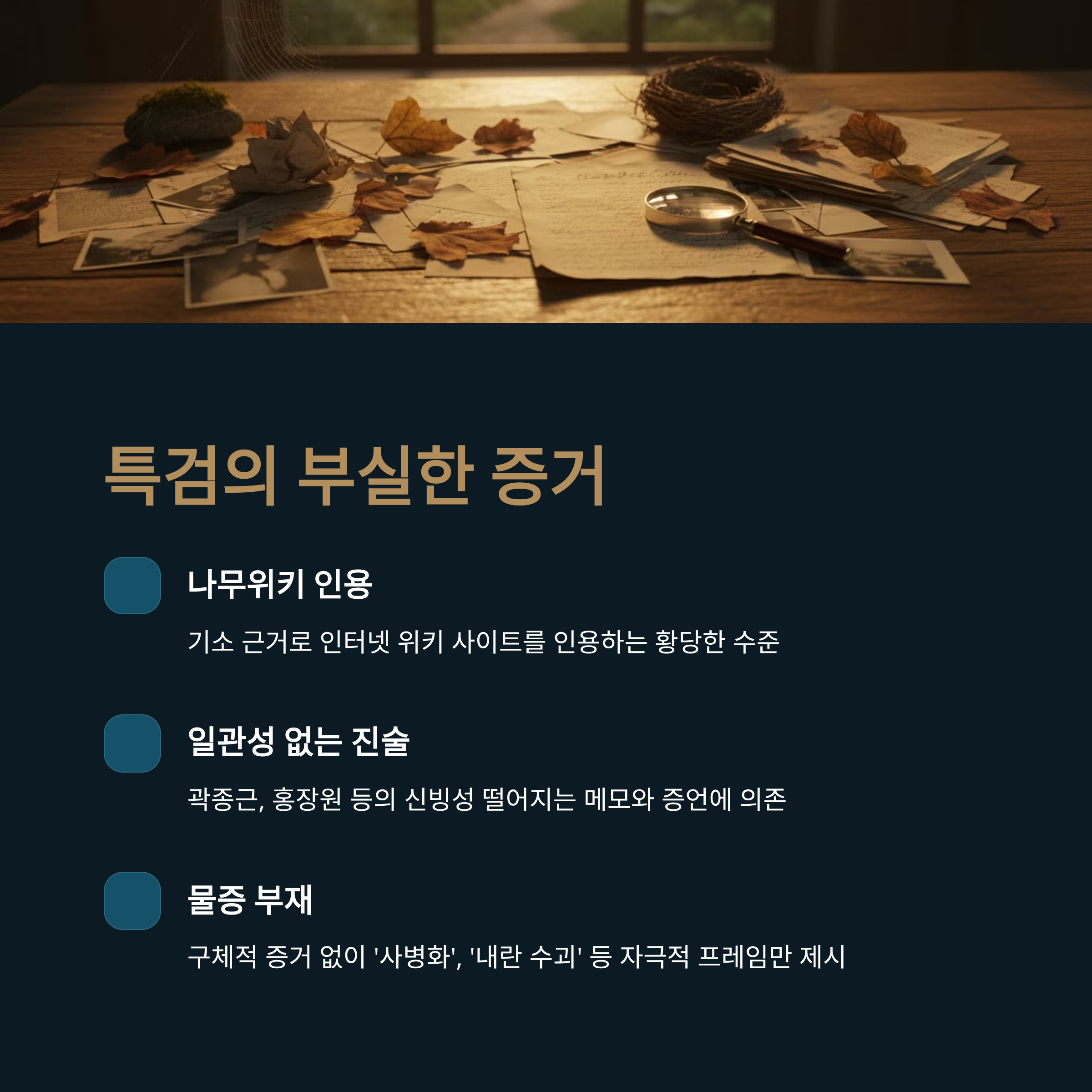 셋째, 명백한 첩보 삭제 기록에도 불구하고 '고의성 입증 부족'을 이유로 무죄를 선고하며 엄격한 증거주의 원칙을 내세웠습니다. 반면 특검은 나무위키나 신빙성 낮은 진술에 의존하고 있어, 동일한 잣대 적용 시 공소 유지가 불가능합니다.