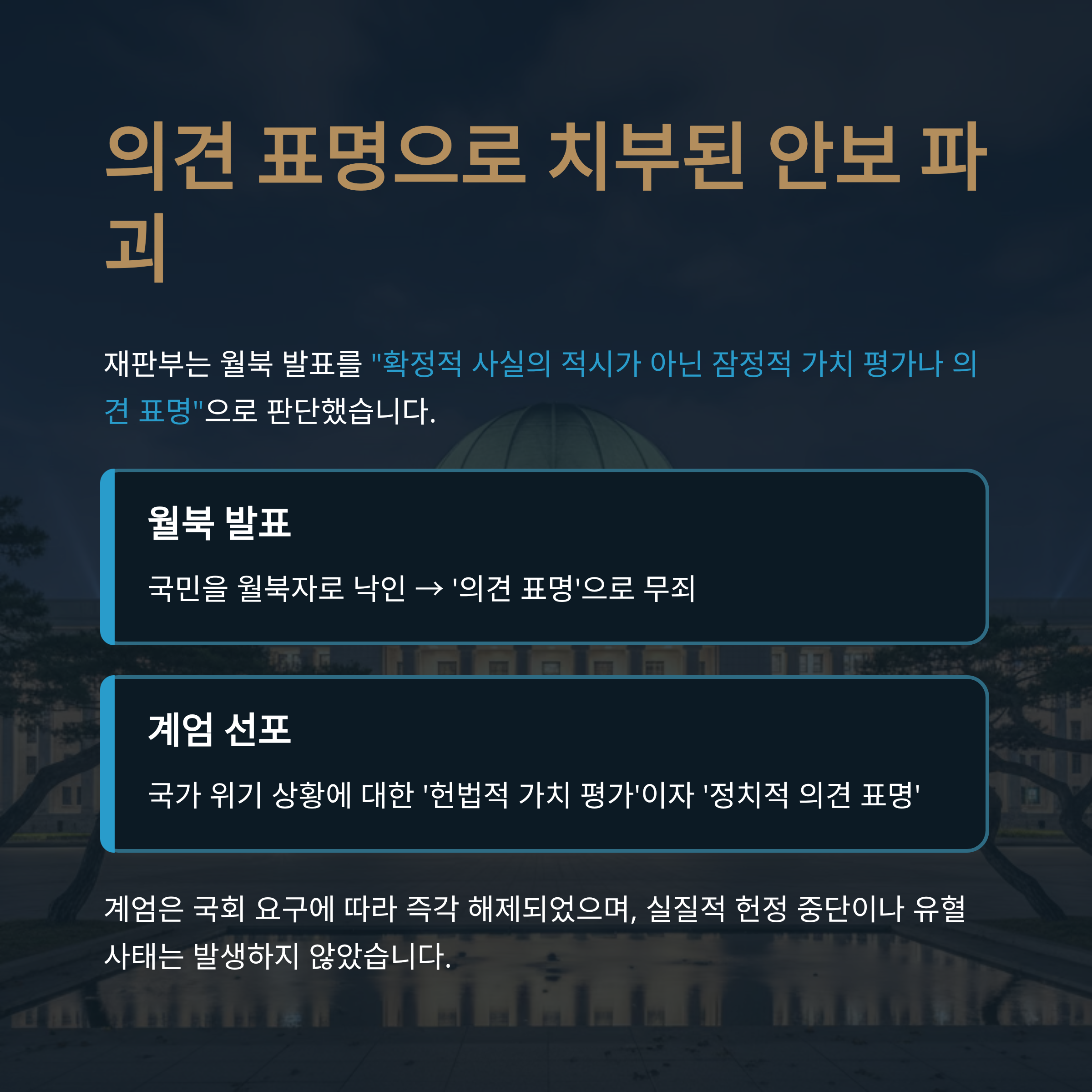 둘째, 월북 발표가 확정적 사실이 아닌 '잠정적 의견 표명'이므로 죄가 되지 않는다고 판단했습니다. 이에 따르면 윤 전 대통령의 계엄 선포 역시 헌법적 가치에 따른 정치적 의사 표명으로 볼 수 있어 내란죄 성립이 어려워집니다.
