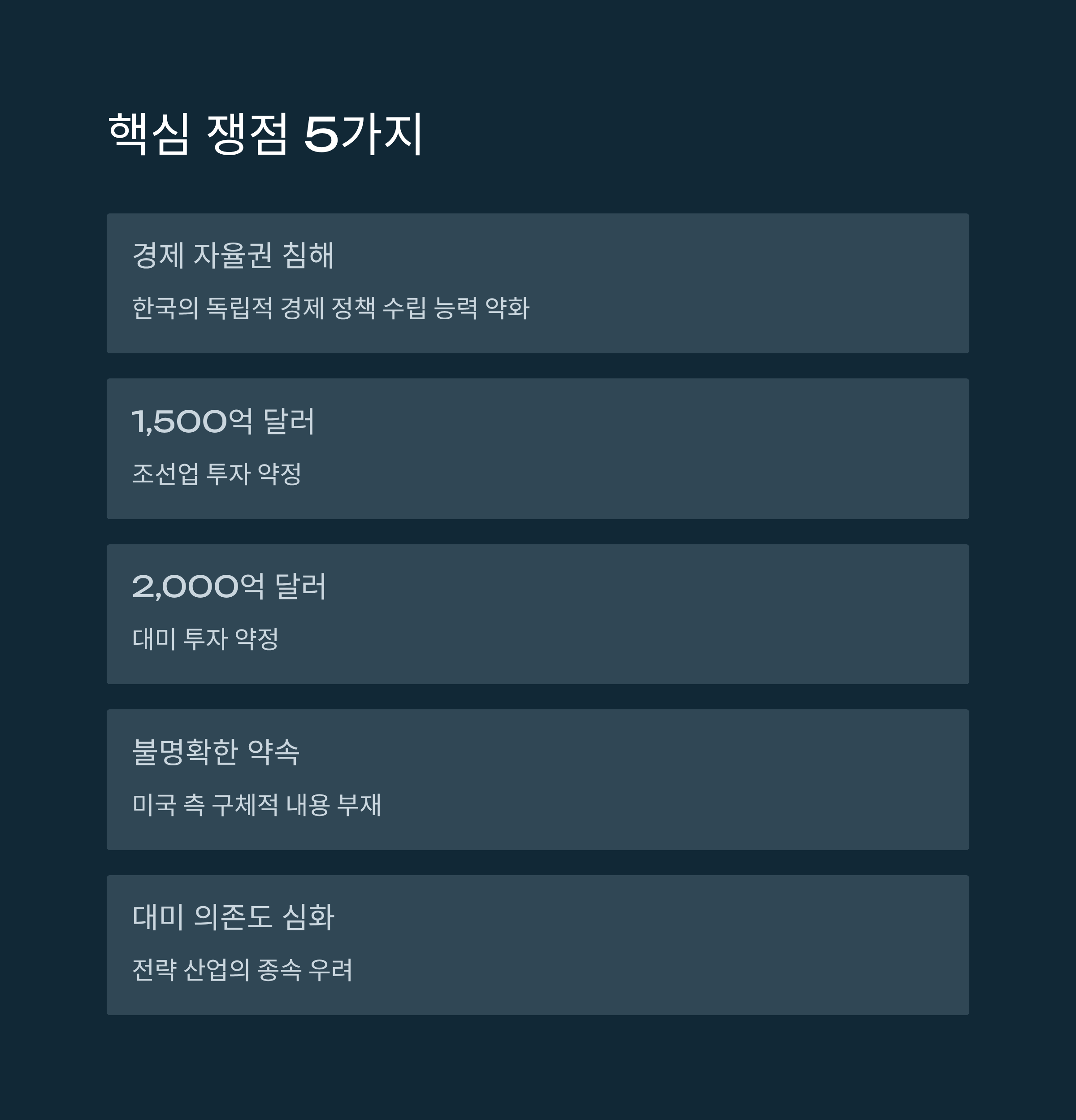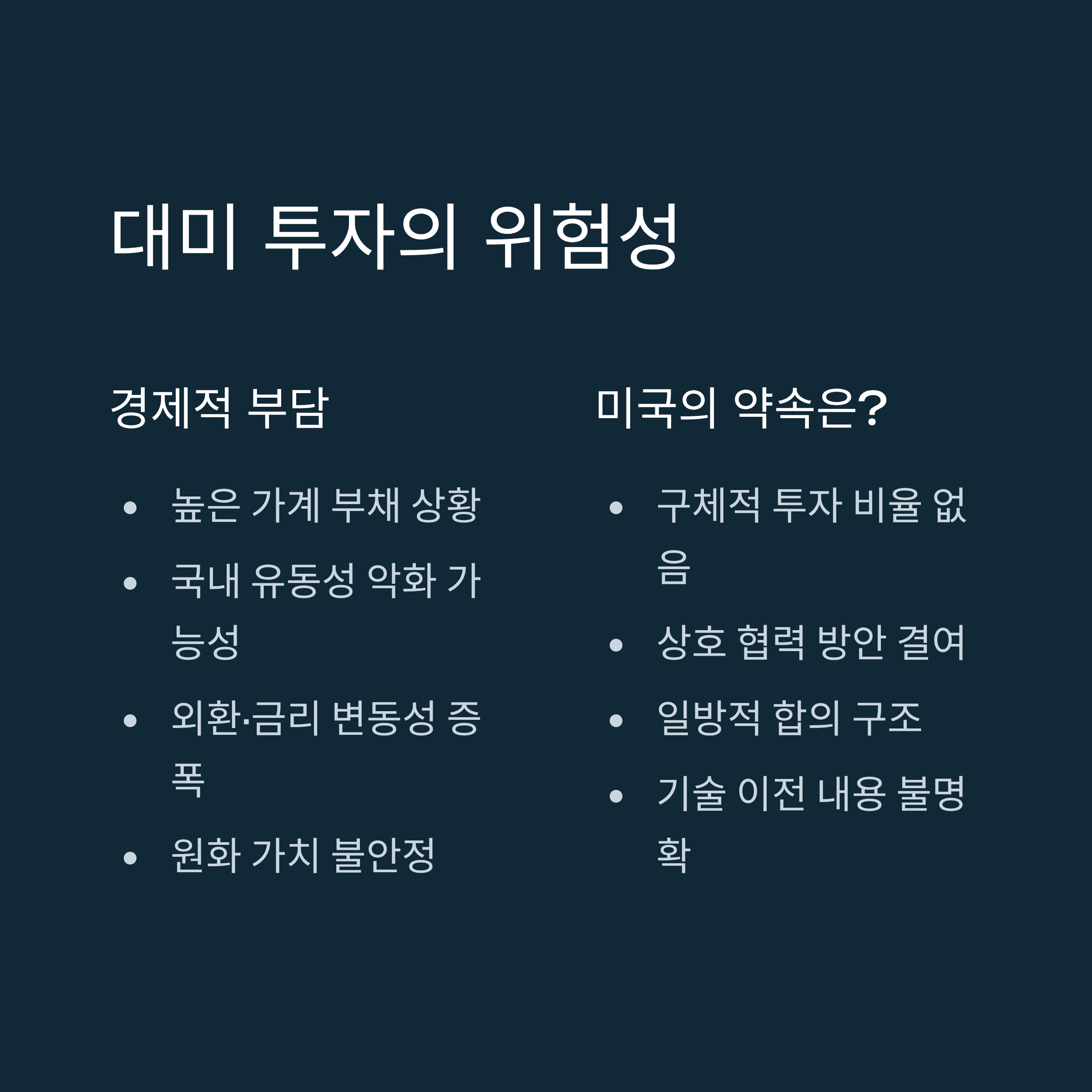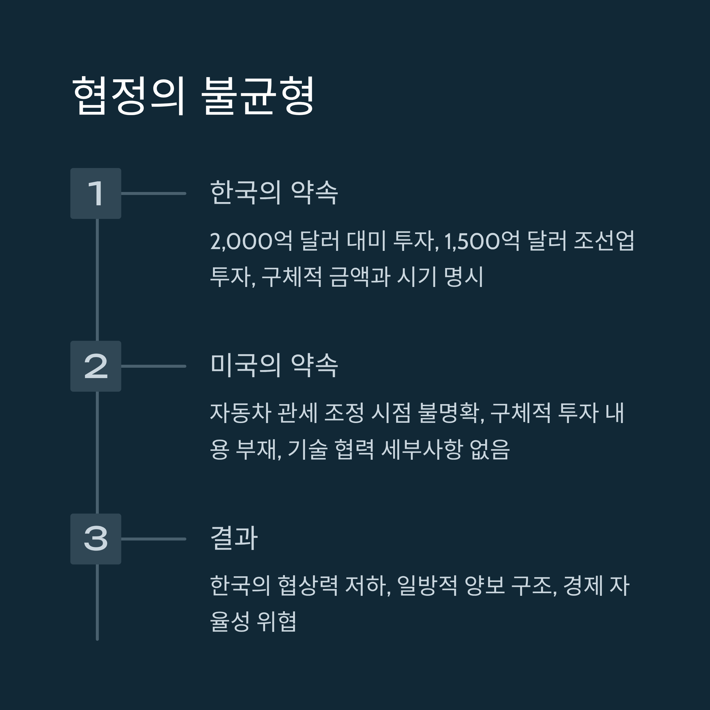 | A. 협정 내용의 불균형으로, 특히 대미 투자가 한국에 부당한 경제적 부담으로 작용할 가능성이 큽니다. 미국 측 약속의 구체성도 미흡합니다. |