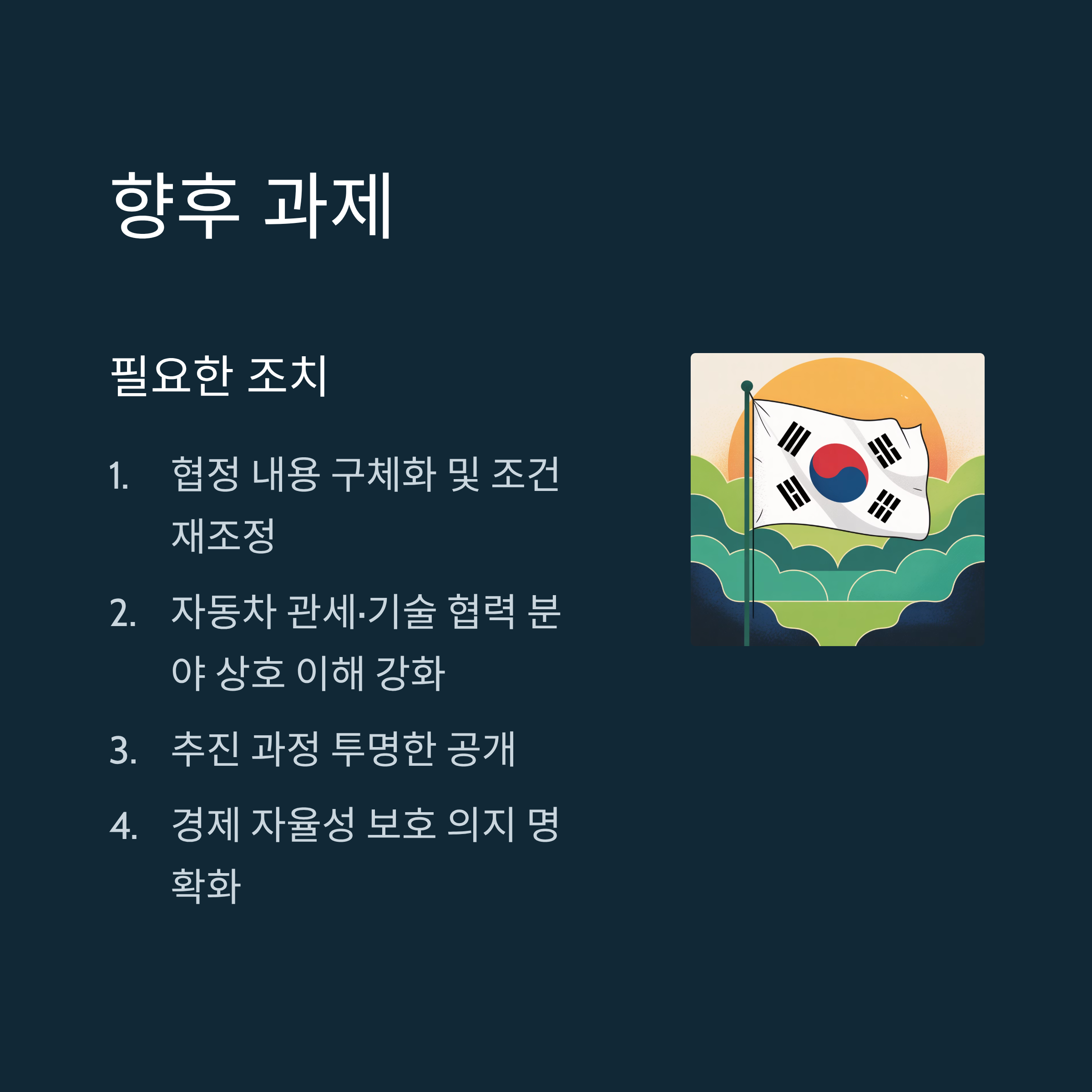 향후 협정 내용 구체화와 조건 조정 과정이 필요하며, 특히 자동차 관세와 기술 협력 등의 분야에서 양국의 상호 이해를 바탕으로 협력 수준을 강화하는 것이 핵심 과제로 남아 있다. 한국 정부는 추진 과정을 투명하게 공개하고, 경제 자율성을 더 이상 희생하지 않겠다는 의지를 명확히 해야 할 것이다.