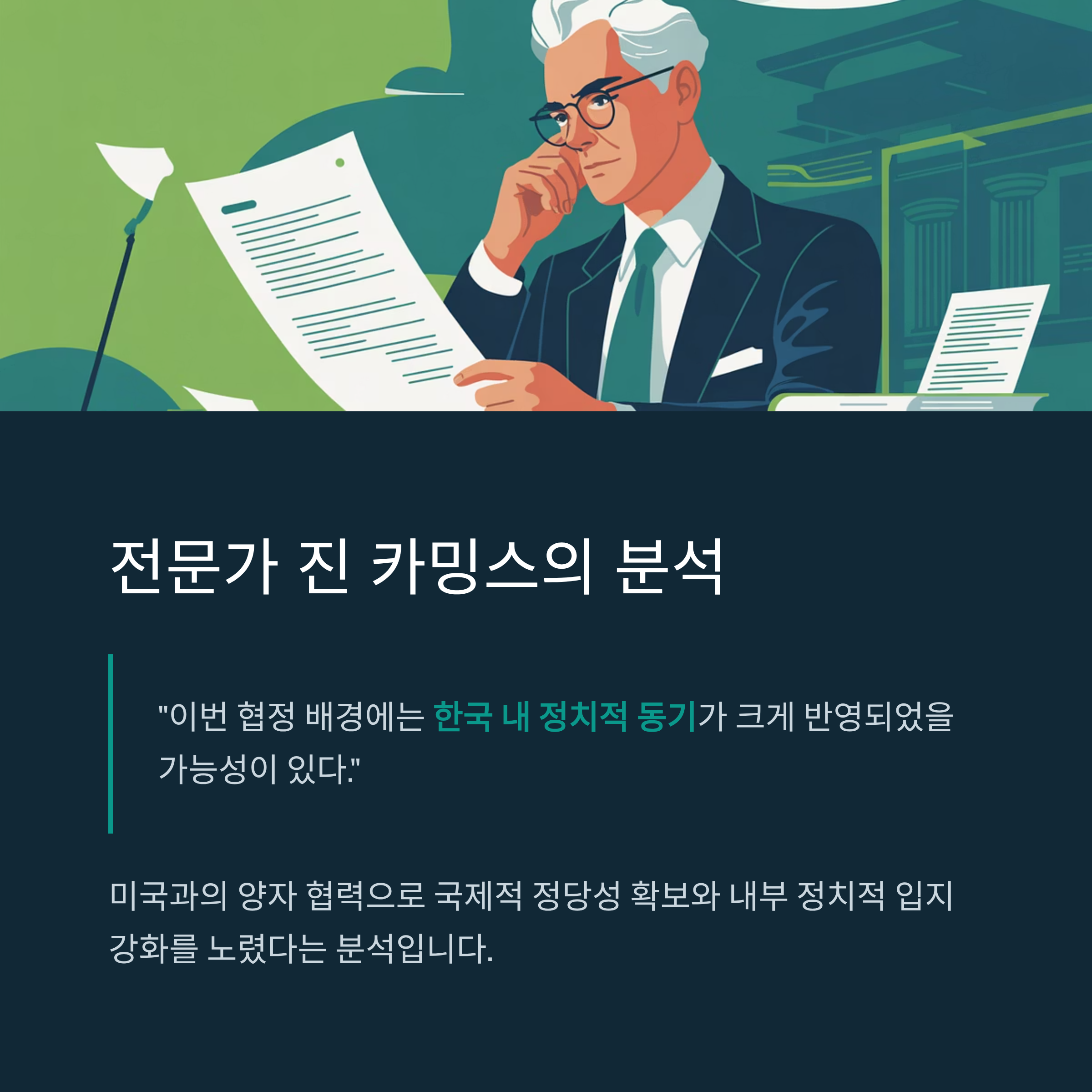 진 카밍스와 같은 미국 전문가들의 주장에 의하면 이번 한미 관세 협정의 배경에는 한국 내 정치적 동기가 크게 반영되었을 가능성이 있다. 한국의 지도자들이 미국과의 양자 협력을 통해 국제적 정당성을 확보하고, 내부 정치적 입지를 강화하기 위한 목적으로 협정을 체결했다는 분석이다.