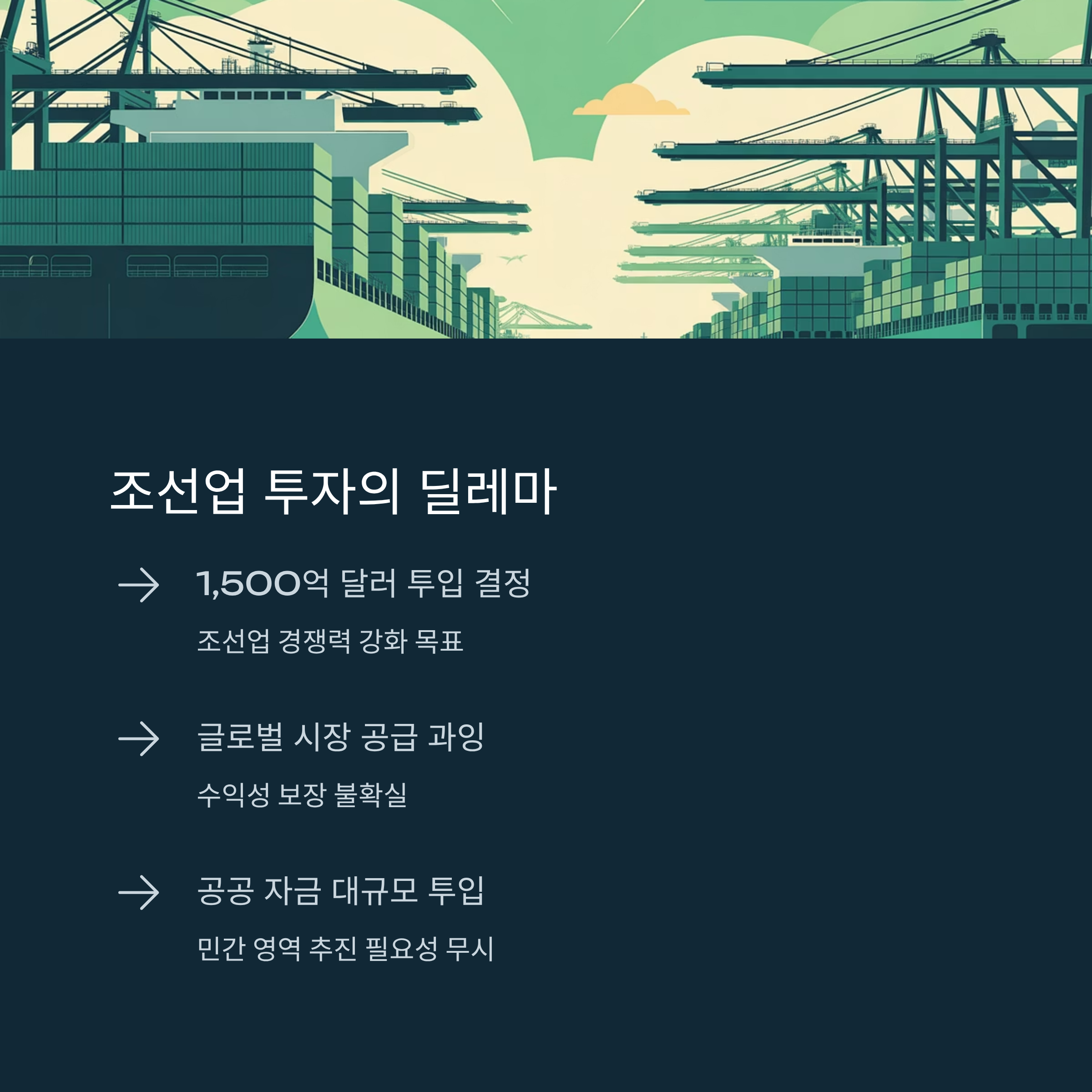 한국이 조선업 발전을 위해 추가적으로 1,500억 달러를 투자하기로 한 결정은 특히 논란의 여지가 크다. 이는 조선업 회복과 경쟁력 강화를 겨냥하고 있지만 이미 공급 과잉 상태인 글로벌 조선 시장에서 과연 이러한 막대한 투자가 실질적 수익성을 보장할 지는 미지수이다.