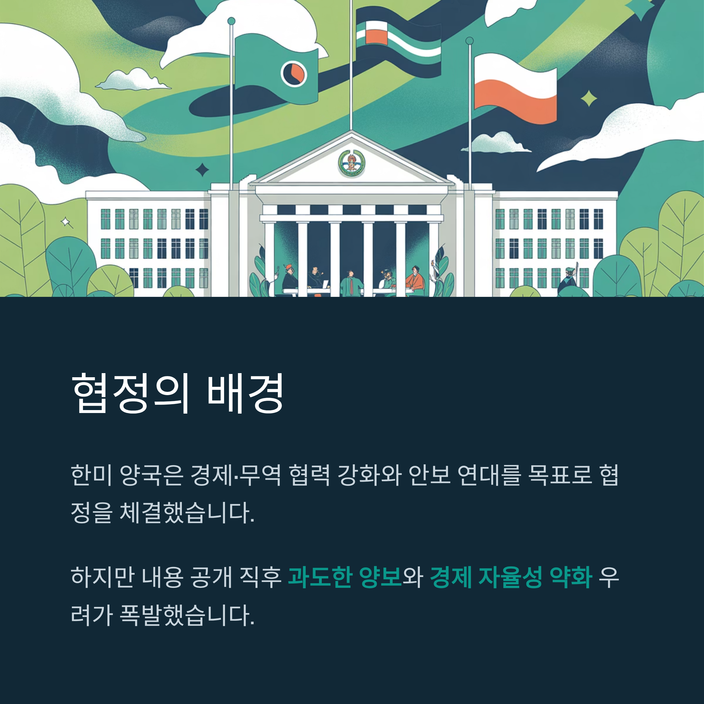 2025년 발표된 한미 관세 협정은 한국과 미국 양국이 경제 및 무역 협력을 더욱 강화하기 위해 체결한 협정으로, 이를 통해 안보 및 외교적인 연대를 도모하려는 의도를 담고 있습니다. 그러나 내용 공개와 동시에 많은 논란이 제기되었습니다. 협정의 조건에서 한국이 미국에 비해 과도한 양보를 선택한 것이 아니냐는 의문이 제기되었으며, 일부 경제 전문가들은 해당 협정이 한국의 경제 자율성을 약화시키고 중장기적으로 불리한 방향으로 흘러갈 수 있다는 우려를 나타냈습니다. 이러한 상황 속에서 전문가들은 이번 협정 체결의 배경과 경제적, 외교적 동기에 대해 분석하며, 또한 협정이 한국 경제에 미칠 다각적 영향을 검토할 필요성을 강조하고 있습니다.