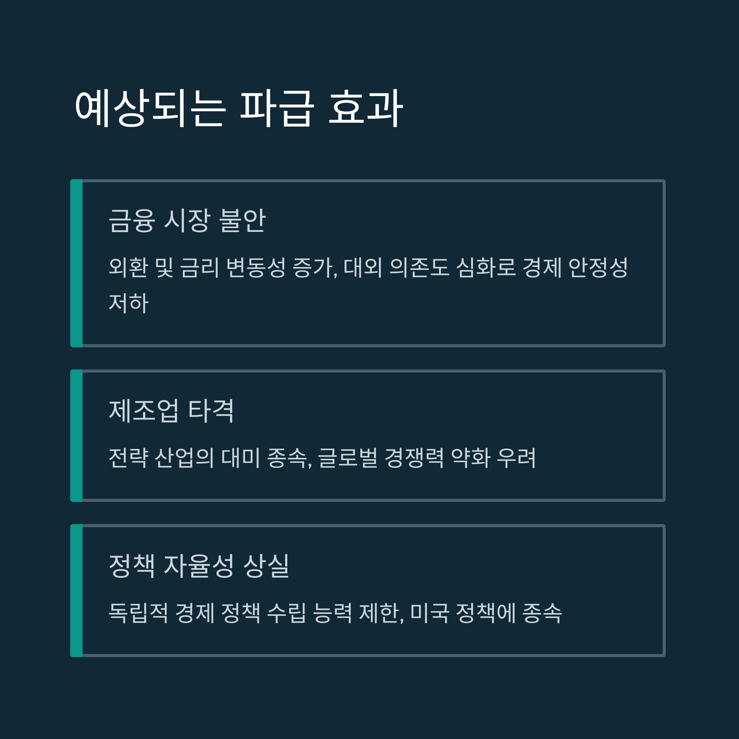 이 협정이 이행될 경우, 한국 주요 산업군의 대미 진출이 어느 정도 활성화될 여지는 있지만, 글로벌 금융 시장에서 한국의 경제적 대외 의존도가 증가함에 따라 외환 및 금리 변동성이 더욱 증폭될 수 있다. 이는 중장기적으로 원화 가치 안정에 영향을 미칠 수 있는 잠재적 위험 요소로 평가된다.