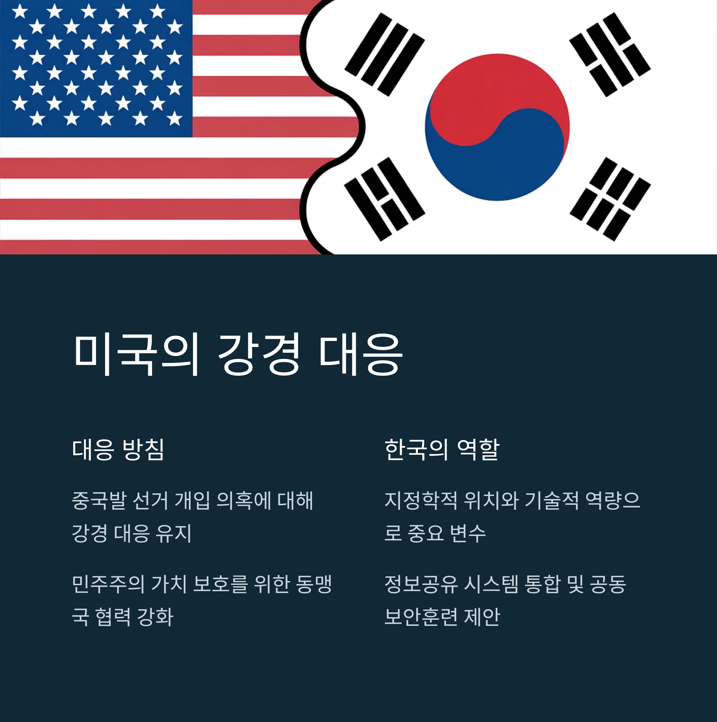 미국은 중국발 선거 개입 의혹에 대해 강경 대응 방침을 유지하면서도 민주주의 가치를 유지하기 위한 동맹국 간 협력 강화에 박차를 가하고 있습니다. 특히, 한국의 역할은 지정학적 위치와 기술적 역량으로 인해 더욱 중요한 변수로 작용할 가능성이 높습니다. 미국은 정보공유 시스템을 한국의 주요 관제소와 통합하거나, 공동 보안훈련 프로그램의 설립을 제안한 것으로 알려졌습니다.