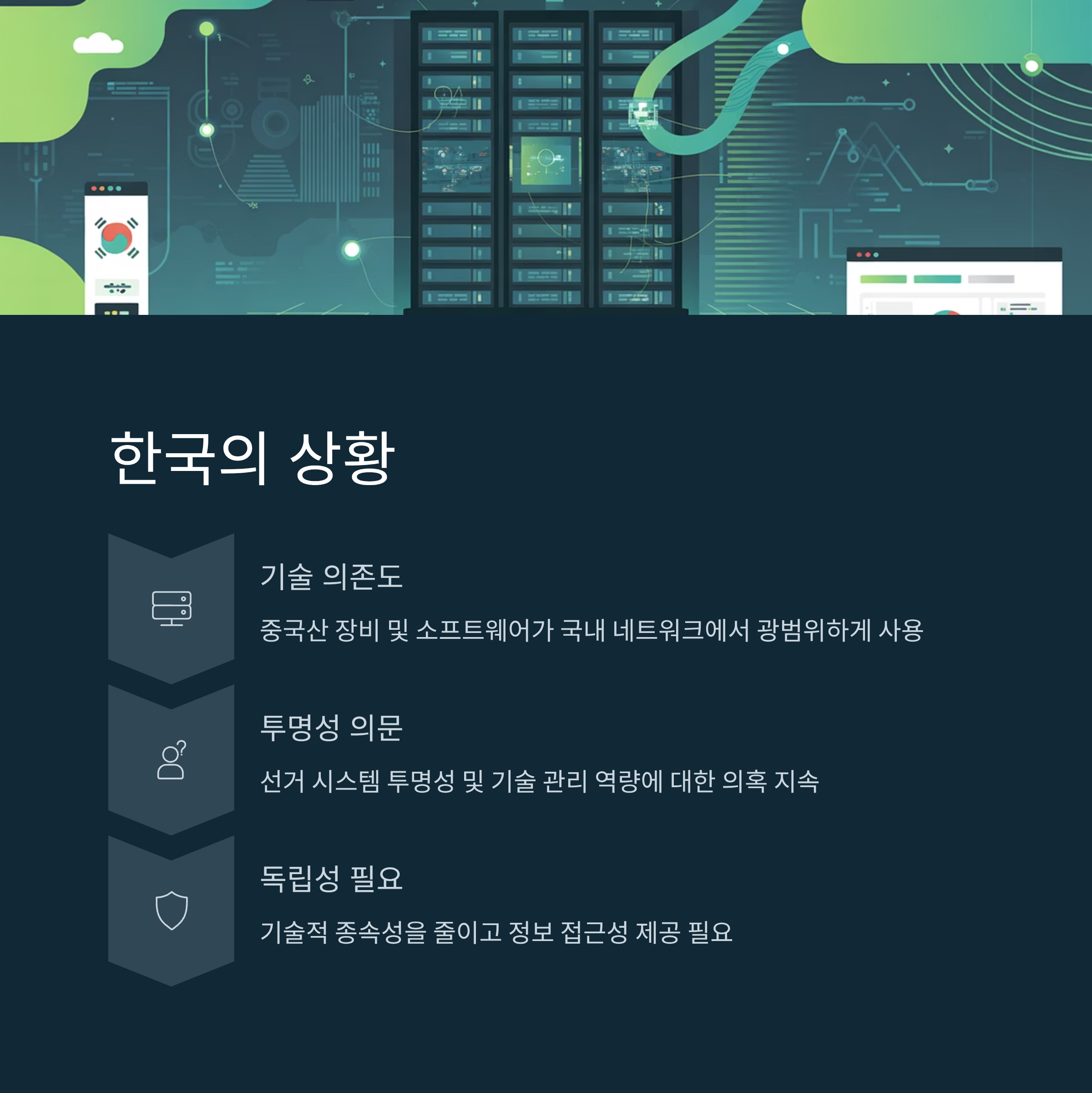 | A. 한국은 일부 데이터 및 통신 인프라에서 중국산 기술 의존도가 높아, 내부 투명성 문제와 데이터 관리에 대한 의구심을 받고 있는 상황입니다. |