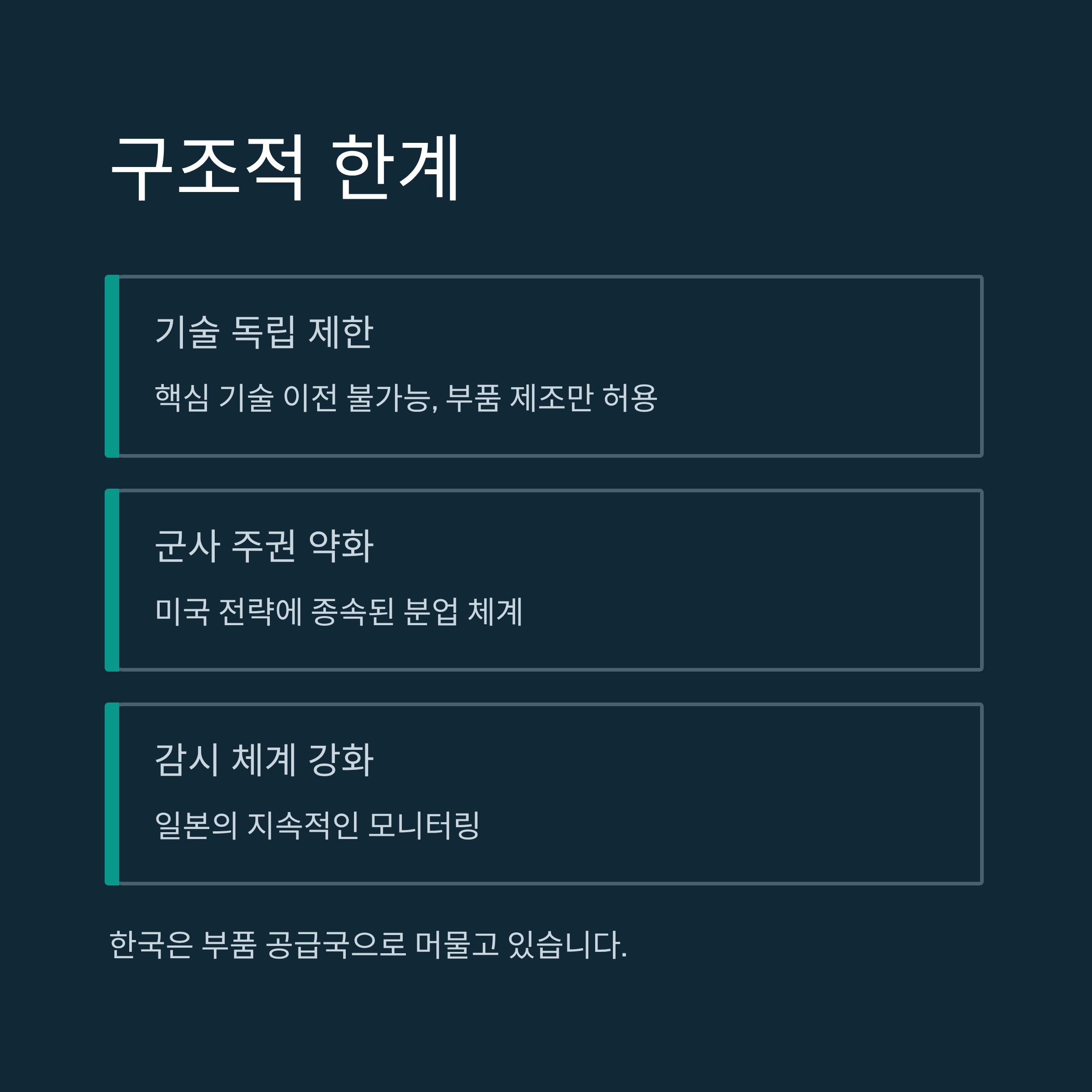 이와 동시에, 일본과의 협력 체계가 한국의 기술 발전보다는 미국의 안보 전략을 위해 설정된 것이라는 인식이 퍼지고 있습니다. 이것은 궁극적으로 한국의 군사 주권이 미국의 동아시아 정책에 종속된 상태를 벗어나기 어렵게 만드는 요인으로 작용할 가능성이 큽니다.