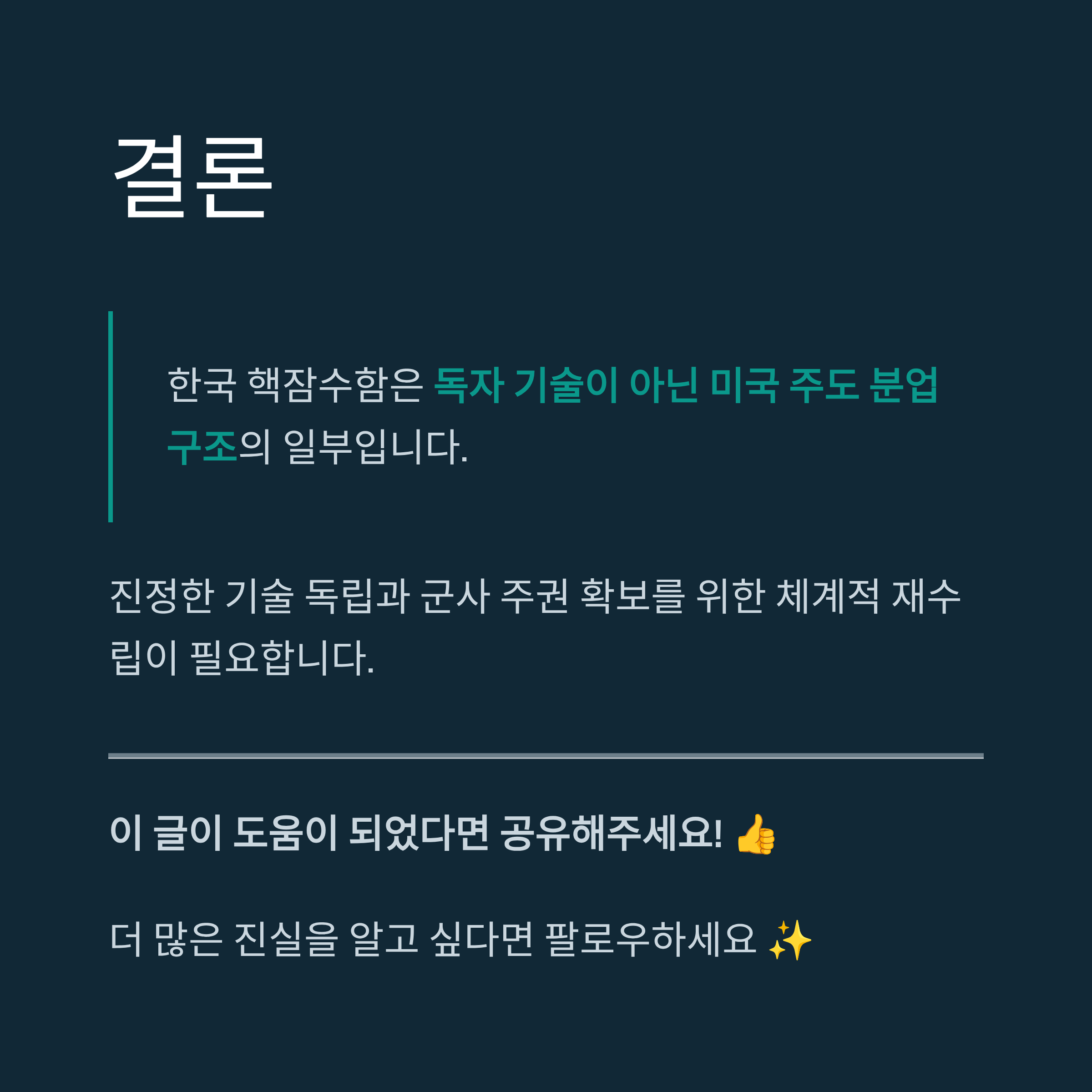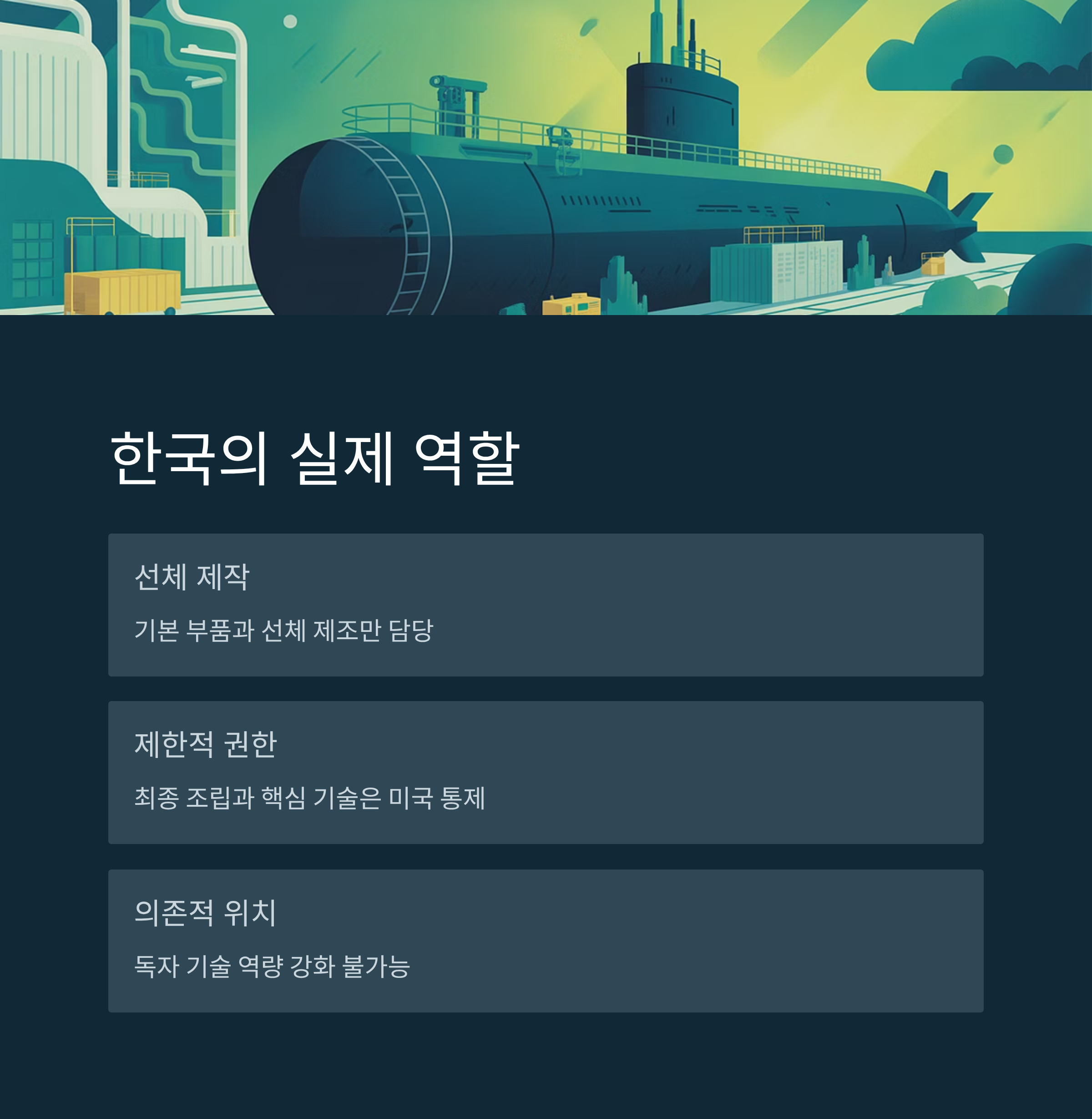 결과적으로, 한국은 핵잠수함 생산에 일정 부분 기여하지만, 기술 주권이나 독립 운영권은 미국이 철저히 관리해 실질적으로는 미국의 군사력 확장을 돕는 부품 공급국으로 머무르고 있습니다.