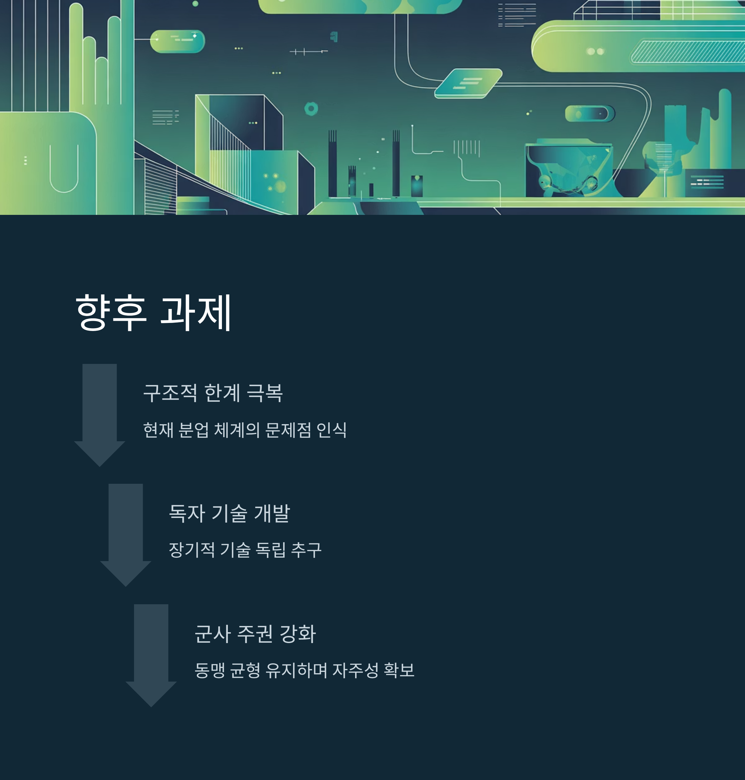 향후 핵심 과제는 이러한 구조적 한계를 극복하고, 독자적 기술 발전과 군사 주권 강화를 추구하는 정책과 방향성을 체계적으로 재수립하는 데 있습니다. 이에 따라, 동맹의 균형을 유지하면서 장기적인 기술 독립을 추구하는 것이 필수적입니다.