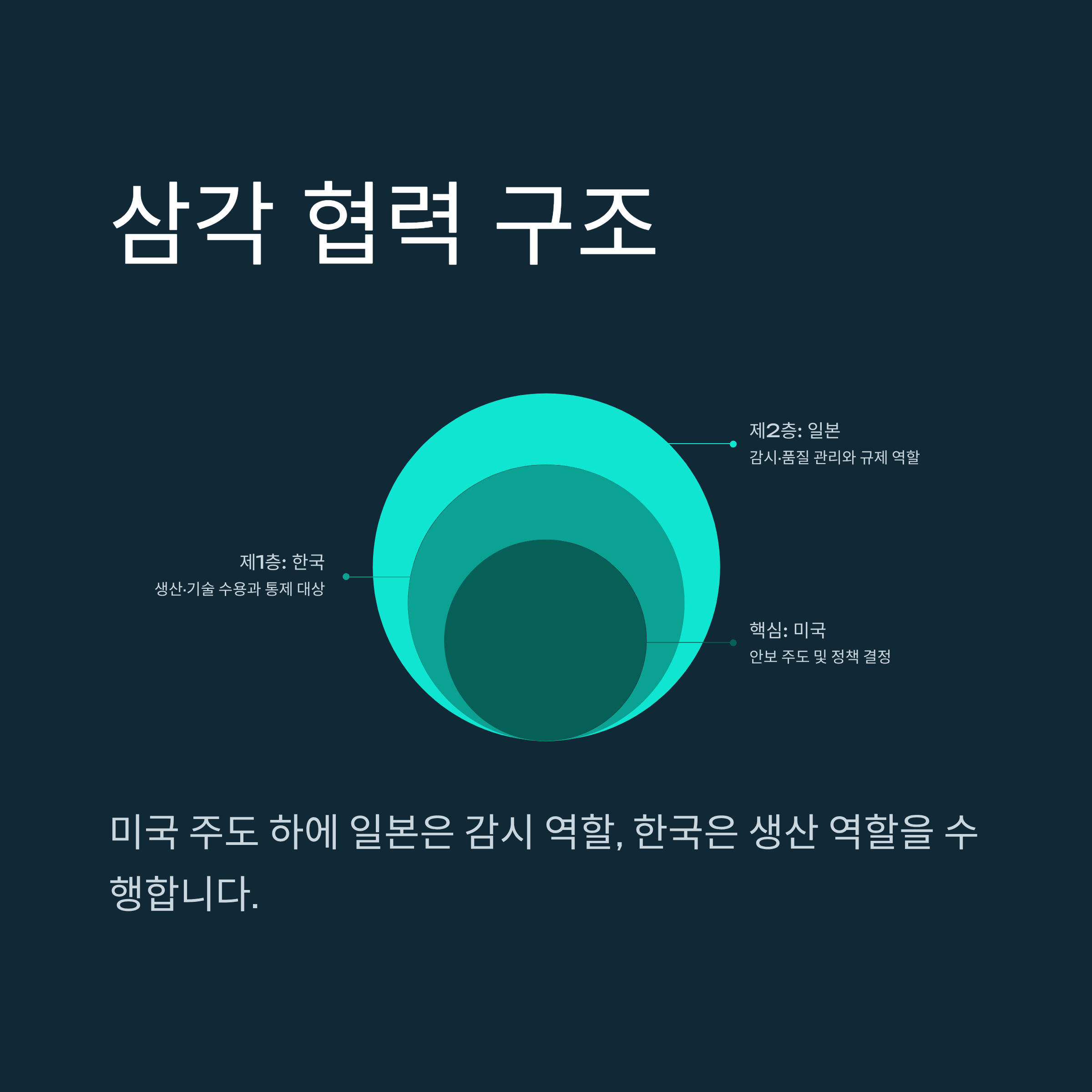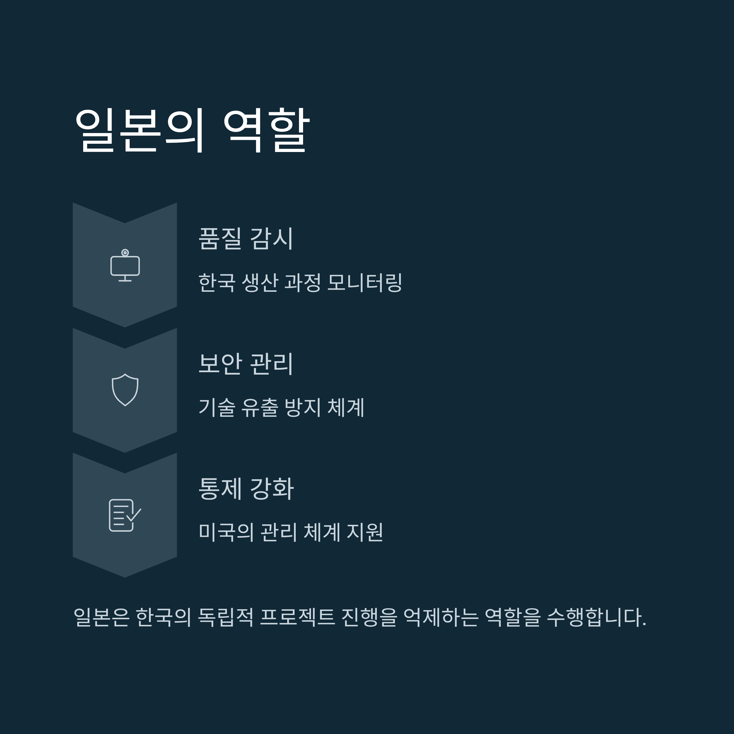 | A. 일본은 한국과 함께 미국 중심의 삼각 협력 구조에서 품질 감시와 보안 관리 역할을 주로 맡고 있습니다. 이는 미국의 통제력을 강화하기 위한 목적으로 볼 수 있습니다. |