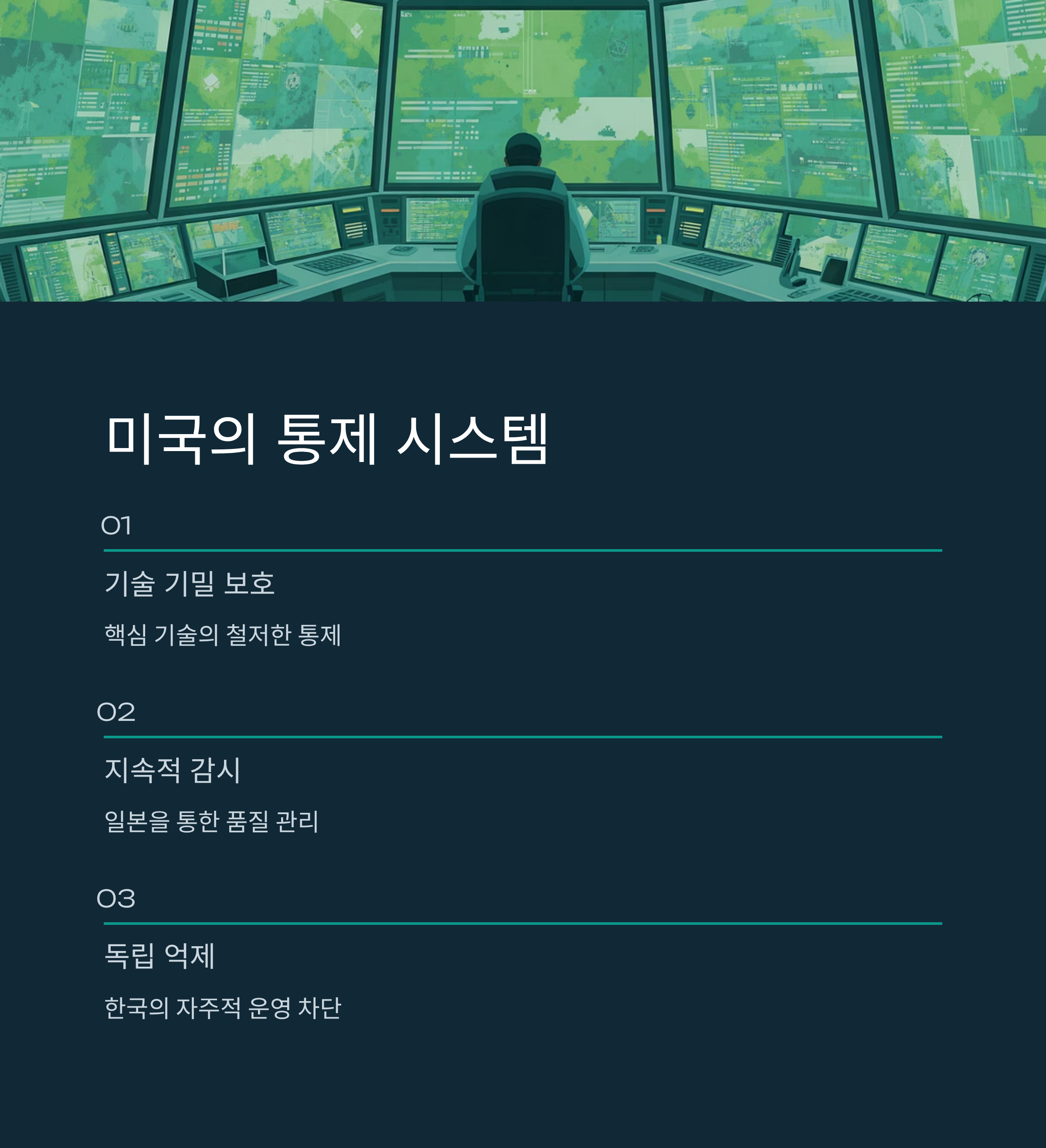 핵잠수함 생산의 민감성을 감안했을 때, 미국의 기술과 군사 기밀은 철저히 보호받아야 합니다. 이를 위해 미국은 일본을 통해 한국의 부품 제조 과정과 품질을 지속적으로 감시하는 체계를 구축했습니다. 이는 군사 기밀 유출 가능성을 차단하는 동시에, 한국이 독립적으로 프로젝트를 진행하지 못하도록 억제하는 역할도 합니다.
