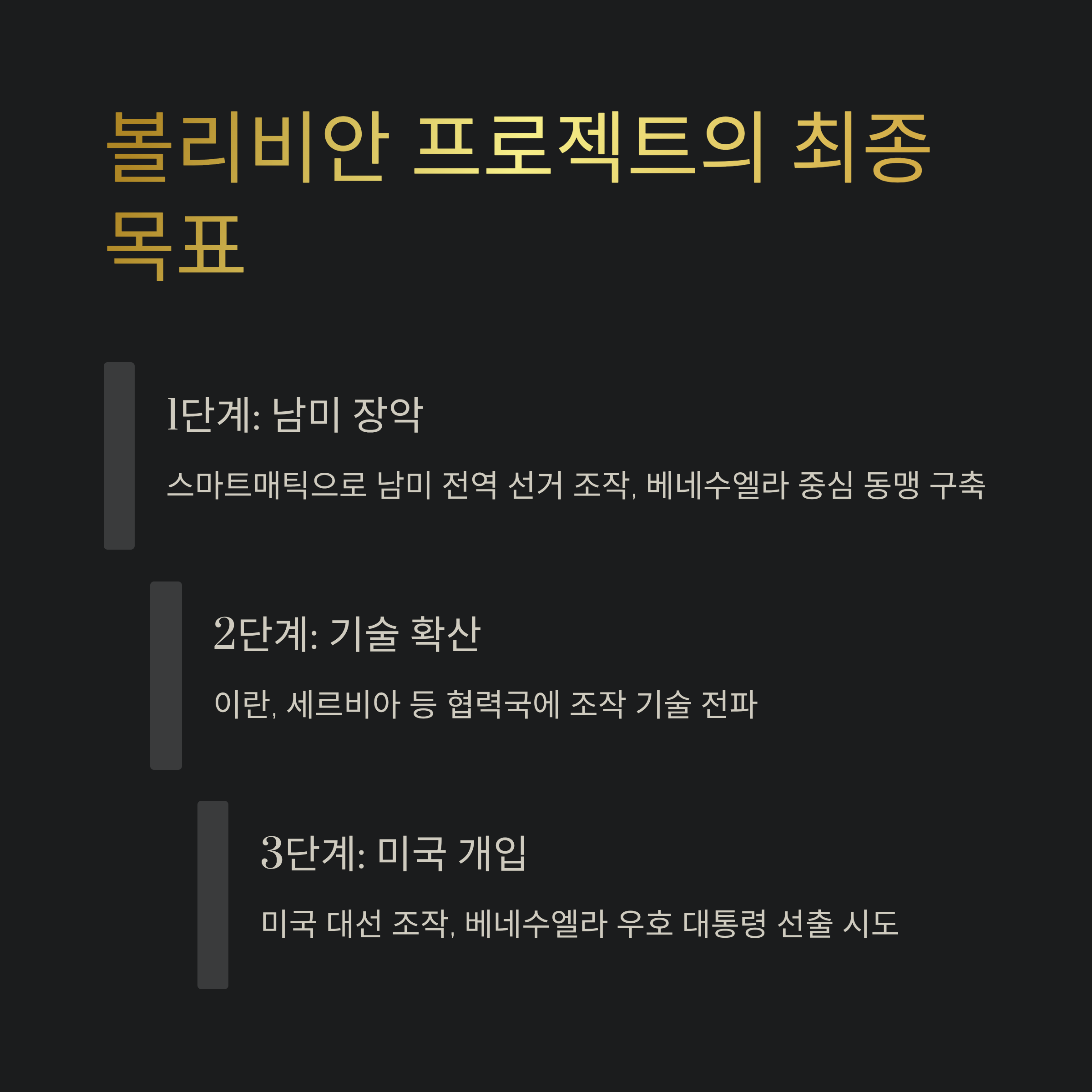 베네수엘라의 우고 차베스가 부정선거의 핵심 도구인 스마트매틱 시스템을 중국에서 제작하도록 지시했다는 구체적인 증언이 나왔습니다. 부정선거 추적 매체인 SCI는 내부 고발자의 진술을 인용하여, 차베스가 자신의 입맛에 맞는 선거 결과를 도출하기 위해 중국의 특정 공장을 지정했다고 보도했습니다. 이는 도미니언 하드웨어가 중국 베이징에서 제조되어 미국으로 밀반입되었다는 기존의 주장과 맥락을 같이하며, 선거 시스템의 하드웨어적 기원이 중국에 있음을 시사합니다. SCI의 분석에 따르면, 차베스가 추진했던 '볼리비안 프로젝트'는 스마트매틱 소프트웨어를 통해 남미 전역의 선거를 조작하여 베네수엘라 중심의 동맹을 구축하는 것이었습니다. 더 나아가 이 기술을 이용해 미국 대선에 개입, 베네수엘라에 우호적인 미국 대통령을 선출하는 것을 최종 목표로 삼았다고 합니다. 투표 전송 과정에서 문제가 발생할 경우 이란과 세르비아가 기술적 지원을 담당했다는 의혹도 제기되었는데, 세르비아 조직의 배후에 중국 공산당이 있다는 주장은 이 사안이 국제적인 정치 공작임을 암시합니다.