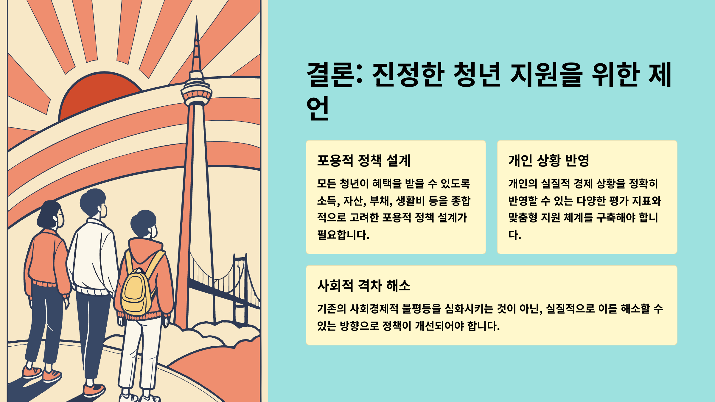단순한 소득 기준에서 벗어나 자산 보유 수준, 지출 구조, 생활 여건 등을 종합적으로 평가할 수 있는 제도로의 전환이 필요합니다. 또한 청년 개개인의 자립 상황을 반영할 수 있는 유연한 심사 체계가 마련되어야 합니다.