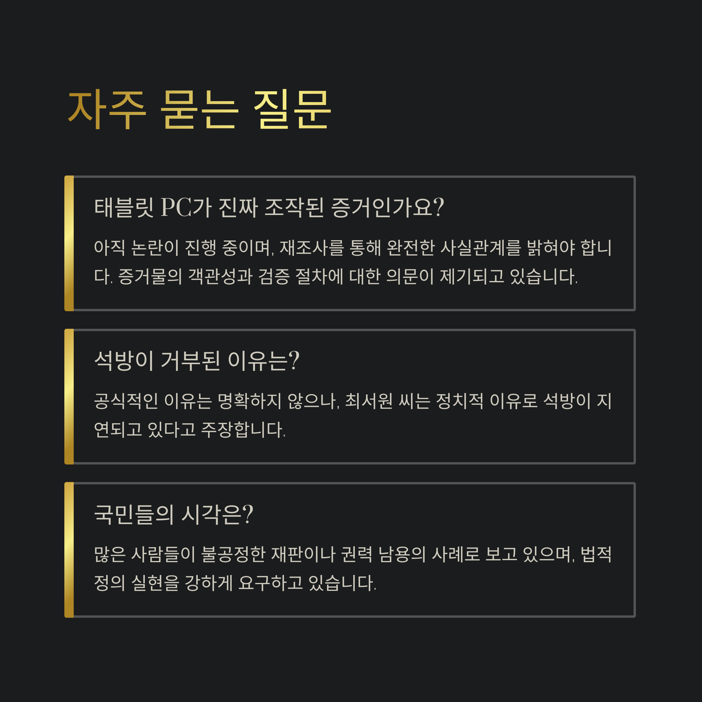 - 태블릿 PC의 조작 논란은 정치권과 법조계에 큰 파장을 일으키며 국민의 신뢰를 흔드고 있습니다.