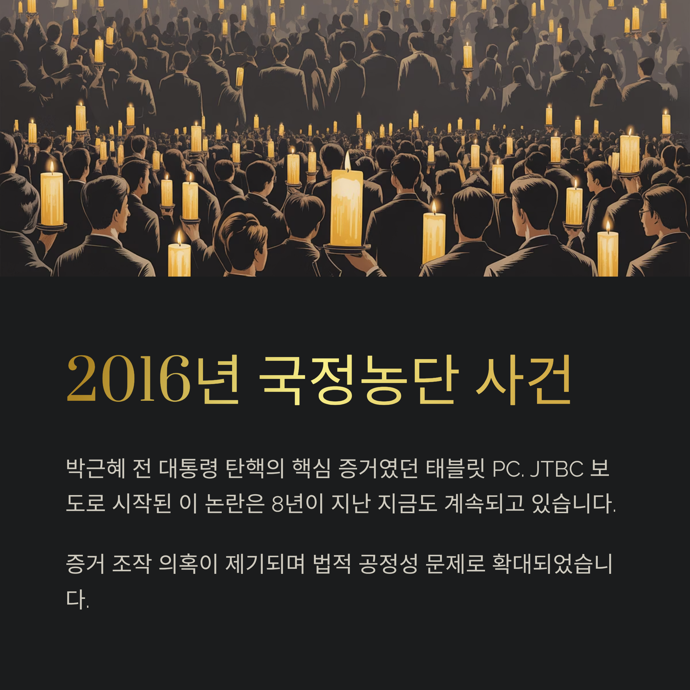 - 2016년 태블릿 PC 논란은 국정농단 사건의 중심에 자리했으며 이후 조작 의혹이 꾸준히 제기되었습니다.
