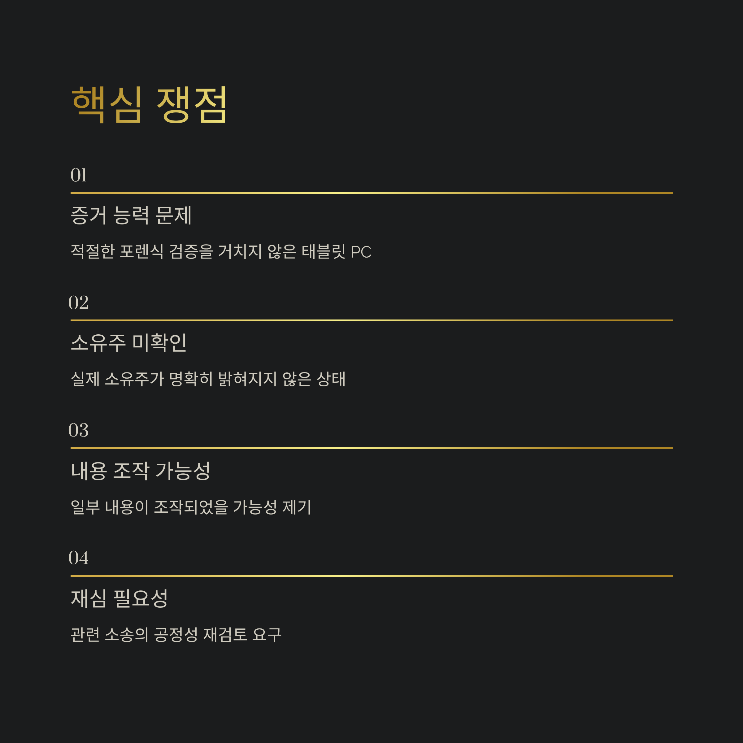 법적으로 중요한 문제는 이 태블릿 PC가 적절한 포렌식 검증을 거쳐 사용되지 않았으며, 내용 일부가 조작되었을 가능성이 있다는 점이다. 만약 이 주장이 사실이라면, 이는 증거 능력의 타당성을 약화시키는 중대한 문제로, 관련 소송에서도 재심의 필요성이 제기된다. 이번 논란은 기존 수사와 재판의 공정성을 심각히 훼손할 여지가 있다.