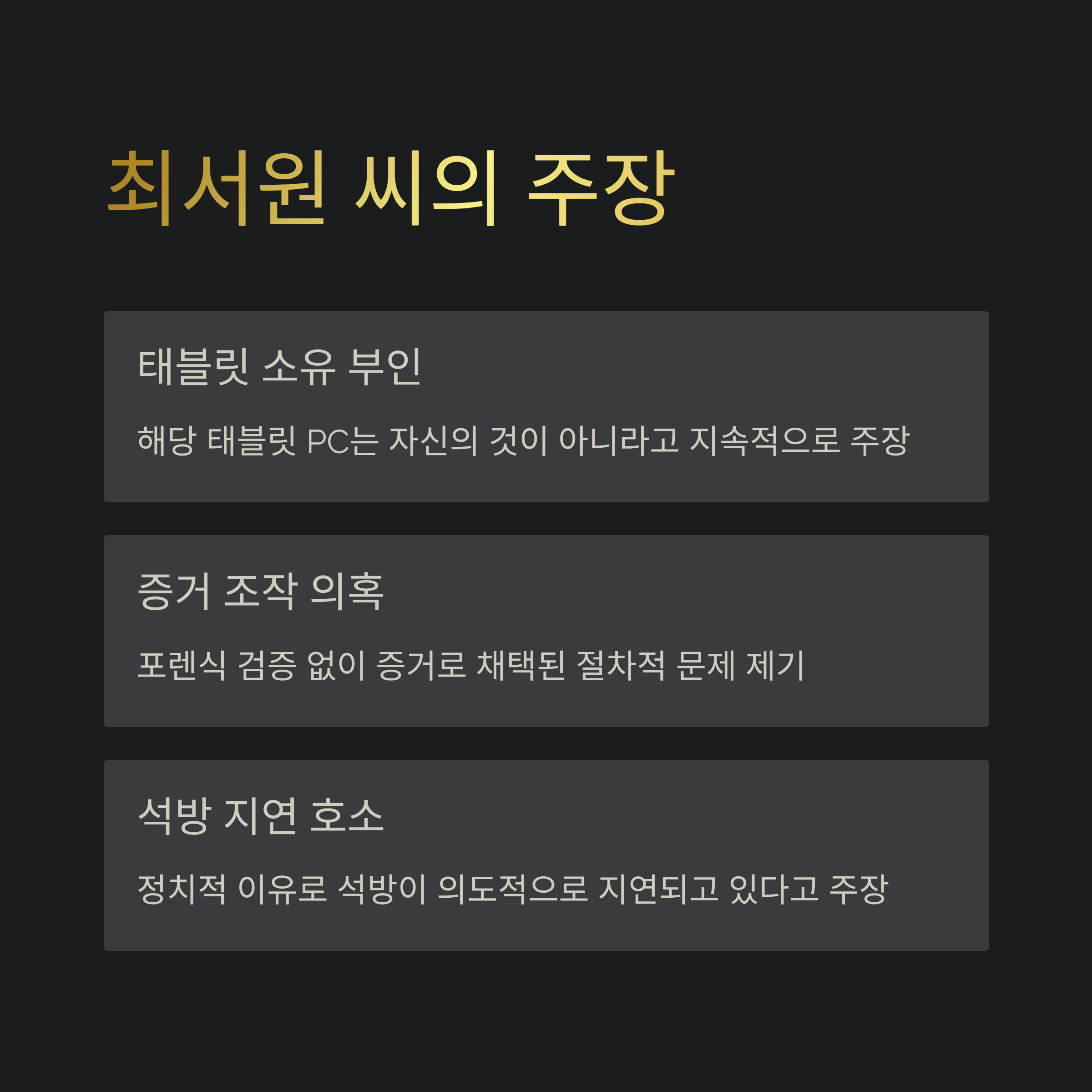 - 최서원 씨는 태블릿 PC가 자신에게 속하지 않으며, 증거가 조작된 것이라고 주장하고 있습니다.