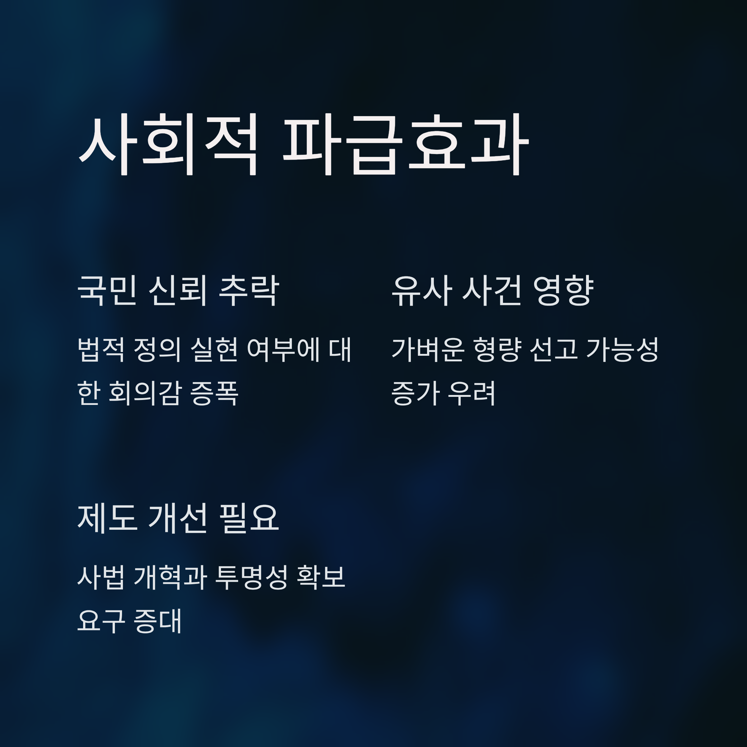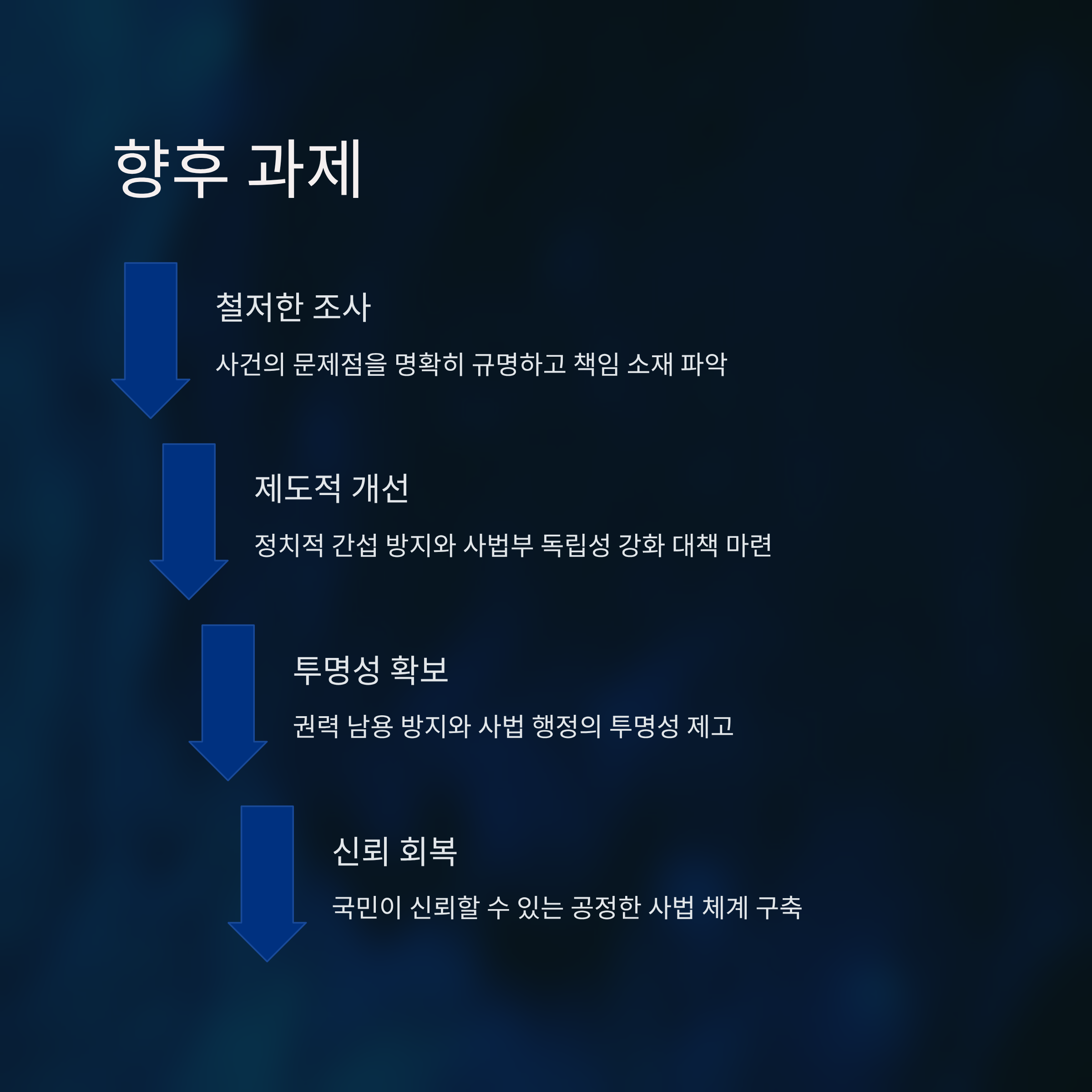이 사건은 사법 개혁과 정치적 간섭으로부터의 독립성을 확보해야 하는 중요성을 다시 한번 부각시켰습니다. 특히 사법부와 검찰은 향후 국민이 신뢰할 수 있는 공정성과 투명성을 입증하기 위해 더욱 깊이 고민하고, 뼈를 깎는 혁신을 이뤄야 합니다.