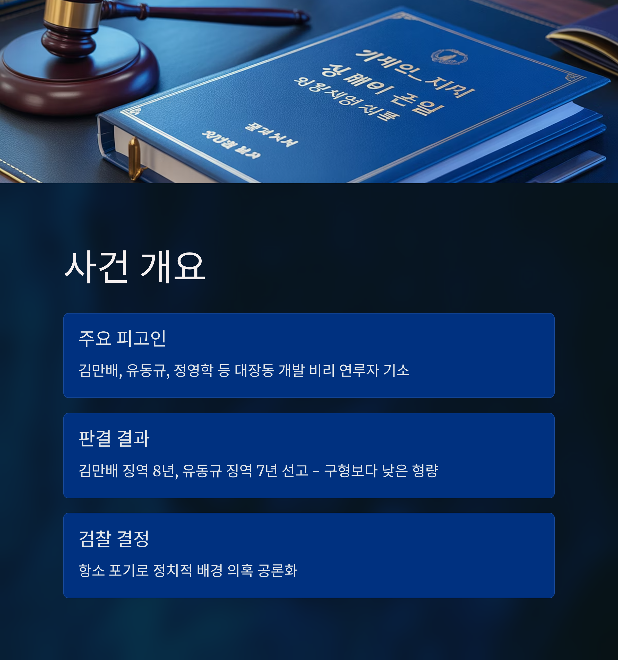 - 판결 결과: 김만배 징역 8년, 유동규 징역 7년으로 기존 구형보다 현저히 낮은 형량이 선고됨.