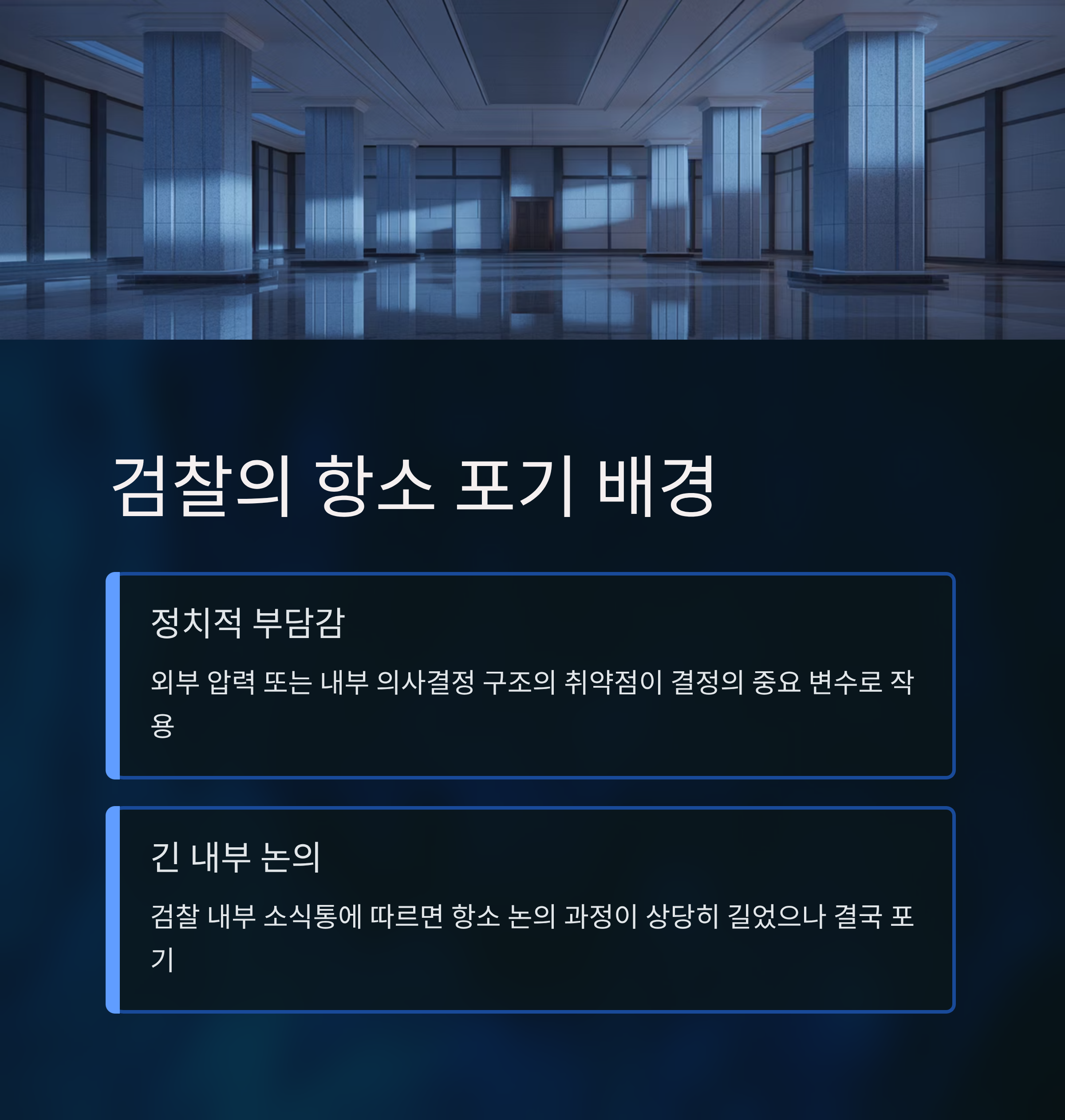 | A. 검찰의 항소 포기 결정에는 정치적 고려와 외부적인 압력이 작용했을 가능성이 제기되고 있습니다. 내부적으로도 상부의 결정을 따르는 과정에서 논란이 있었다고 알려졌습니다. |