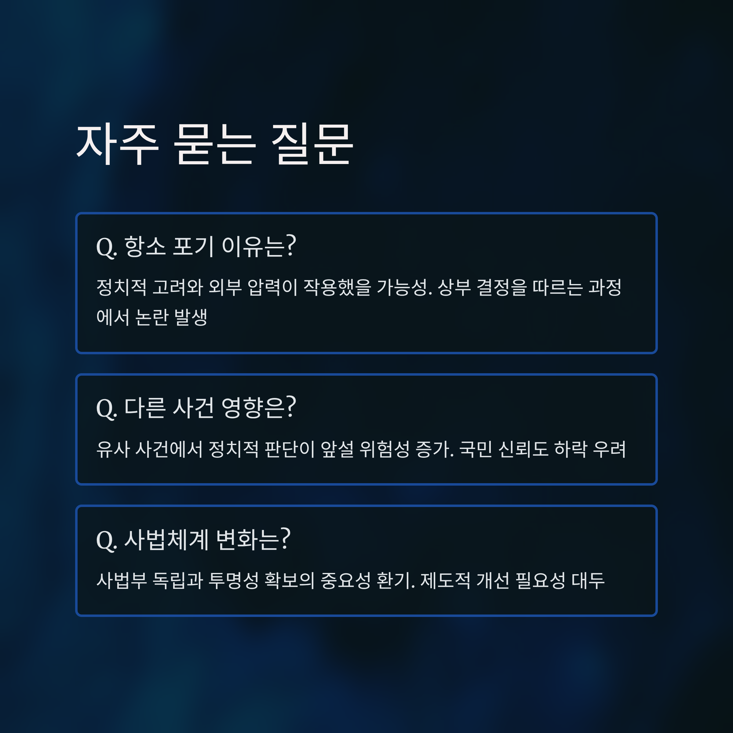 전문가들은 이번 항소 포기 결정이 검찰 권한의 제한된 사용으로 이어질 수 있으며, 재발방지책 마련 필요성을 제기하고 있습니다. 이는 사법 체계의 근본적인 신뢰에 또 한 번의 도전이 되었으며, 국민들은 이 사건을 공정성과 원칙이 질서 있게 적용되는지의 본보기로 바라보고 있습니다.