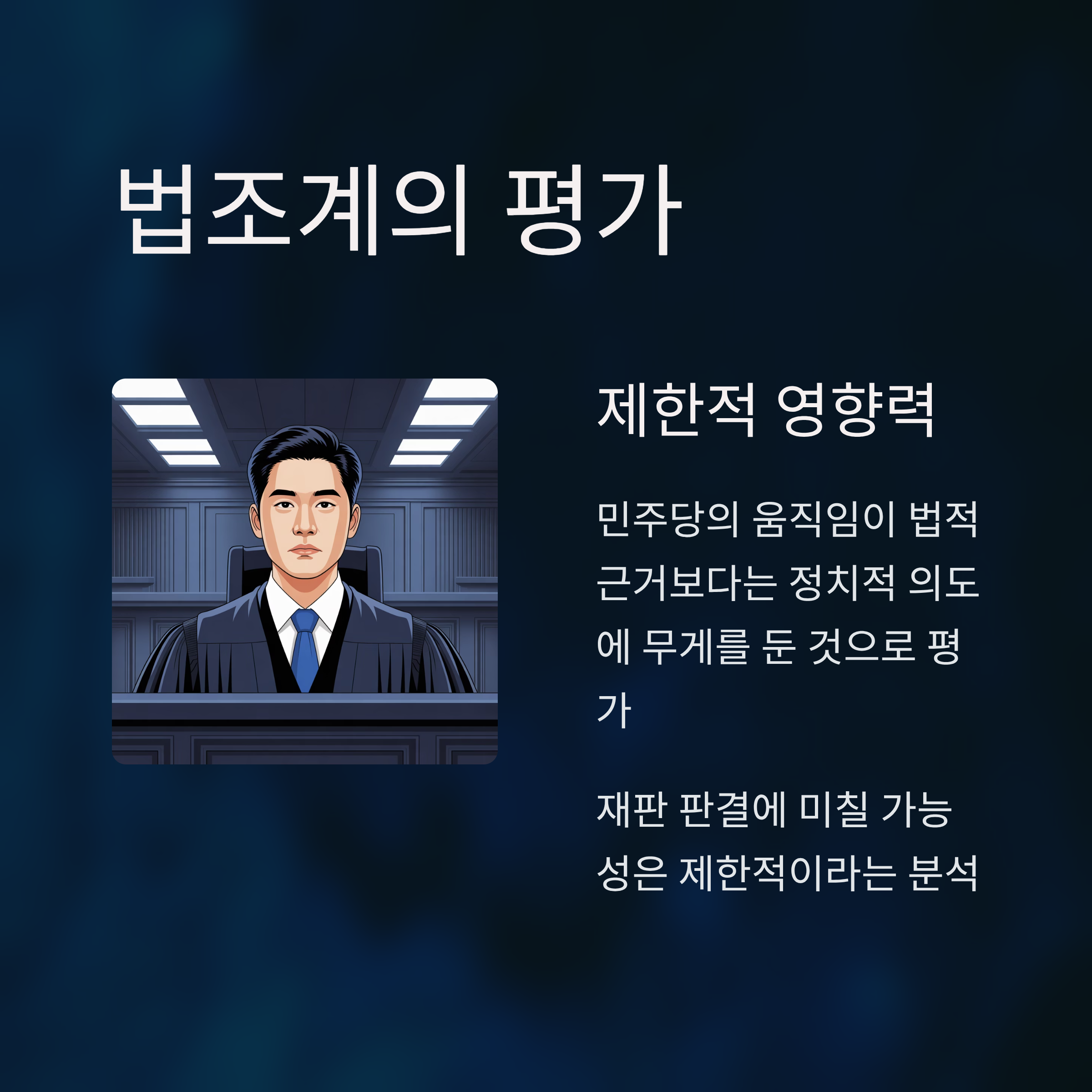 - 법조계는 민주당의 행동이 재판 무효화 또는 공소 취소 목표로 해석되며 공정성과 객관성을 확보하기 위한 노력이 필요하다고 평가합니다.