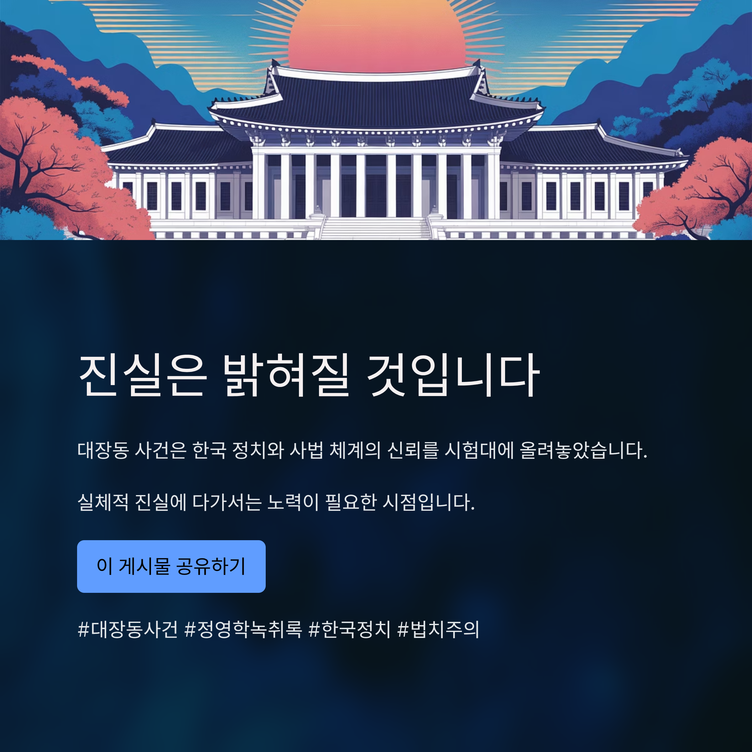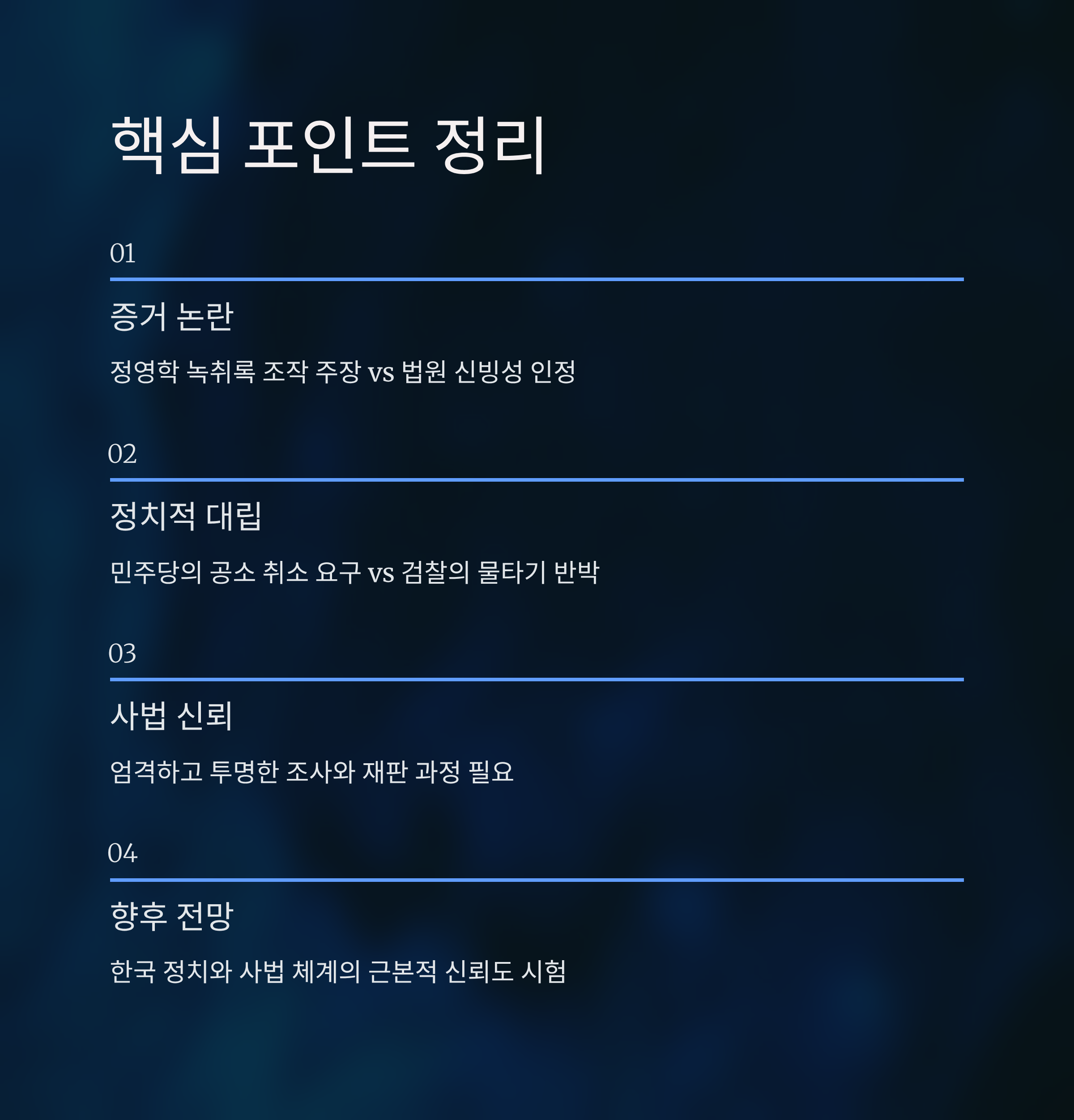 정영학 녹취록을 둘러싼 조작 논란은 대장동 사건의 실체를 파악하는 데 중요한 분기점이 될 가능성이 있습니다. 그러나 이미 법원에서 해당 녹취록의 신빙성과 증거 기능이 여러 차례 확인된 만큼, 민주당이 제기한 조작 의혹은 법적 다툼 이상의 정치적 논쟁으로 간주될 가능성이 높습니다. 이 논란은 한국 정치와 사법 체계의 신뢰를 다시금 시험대에 올려놓았습니다. 따라서 이번 사건을 통해 정치적 실패가 아닌 공정과 신뢰 회복의 기회가 될 수 있도록 실체적 진실에 다가서는 노력이 필요합니다. 대중이 원하는 것은 특정 세력의 이득이 아니라 사건의 투명한 전말과 책임 있는 사법적 판단일 것입니다.