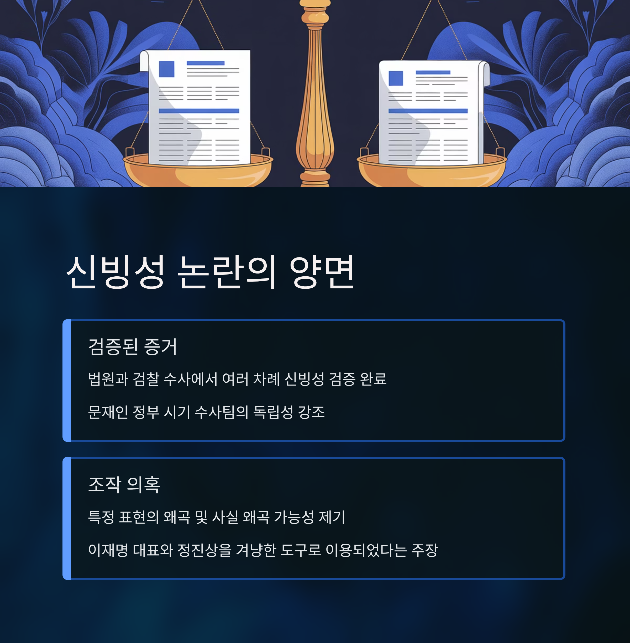 - 검찰은 해당 증거가 수차례 법원에서 신빙성을 인정받았으며, 민주당의 주장은 근거 없는 물타기라고 반박하고 있습니다.