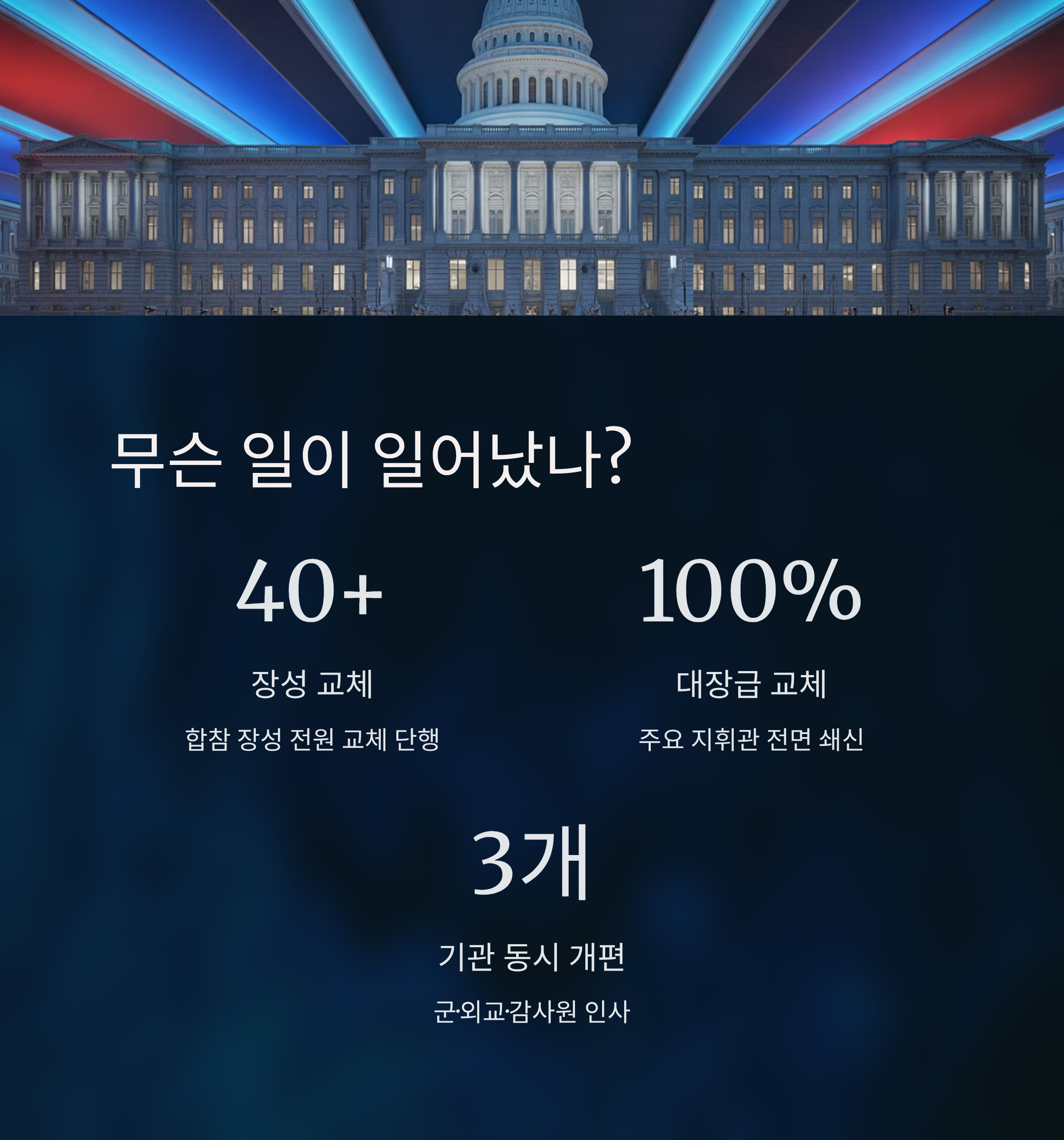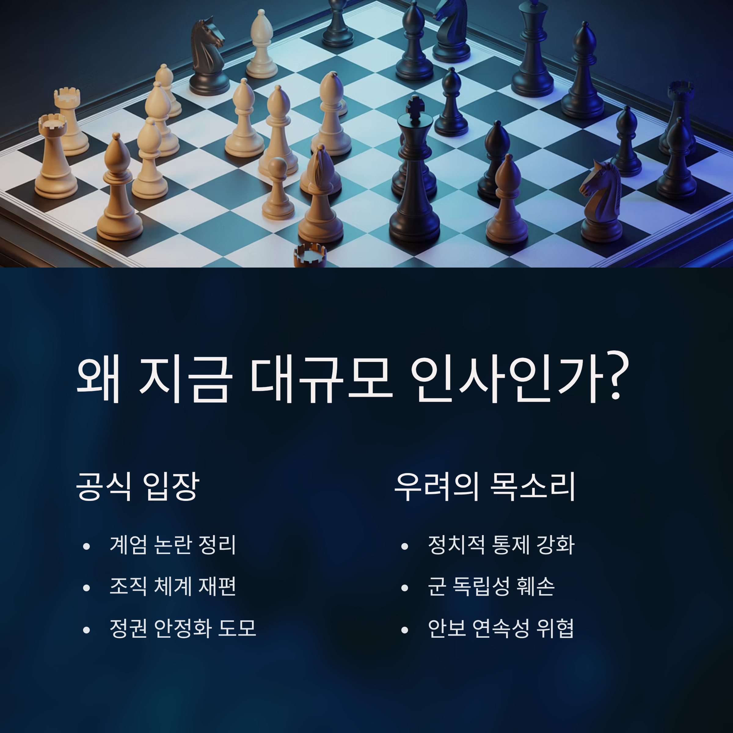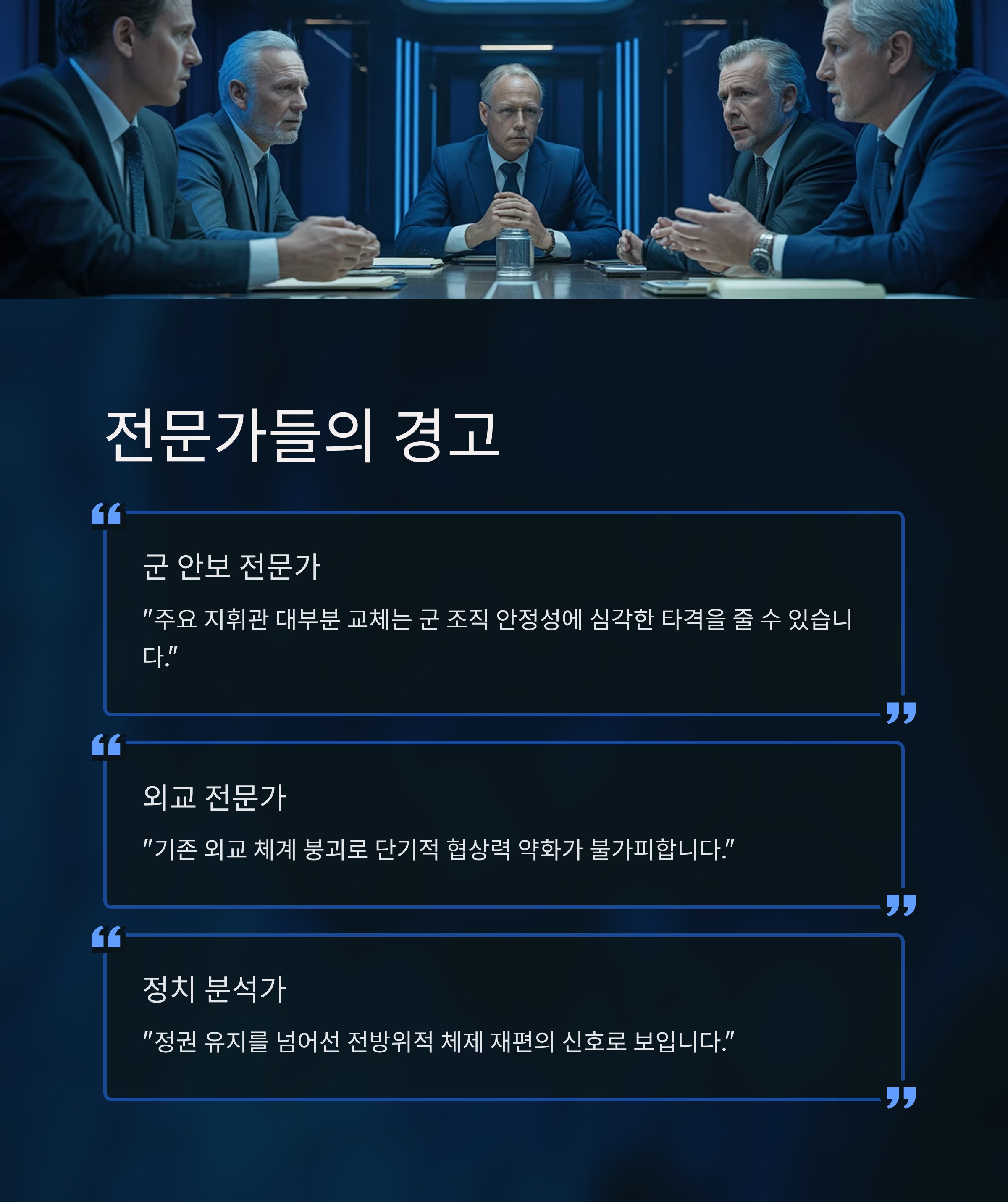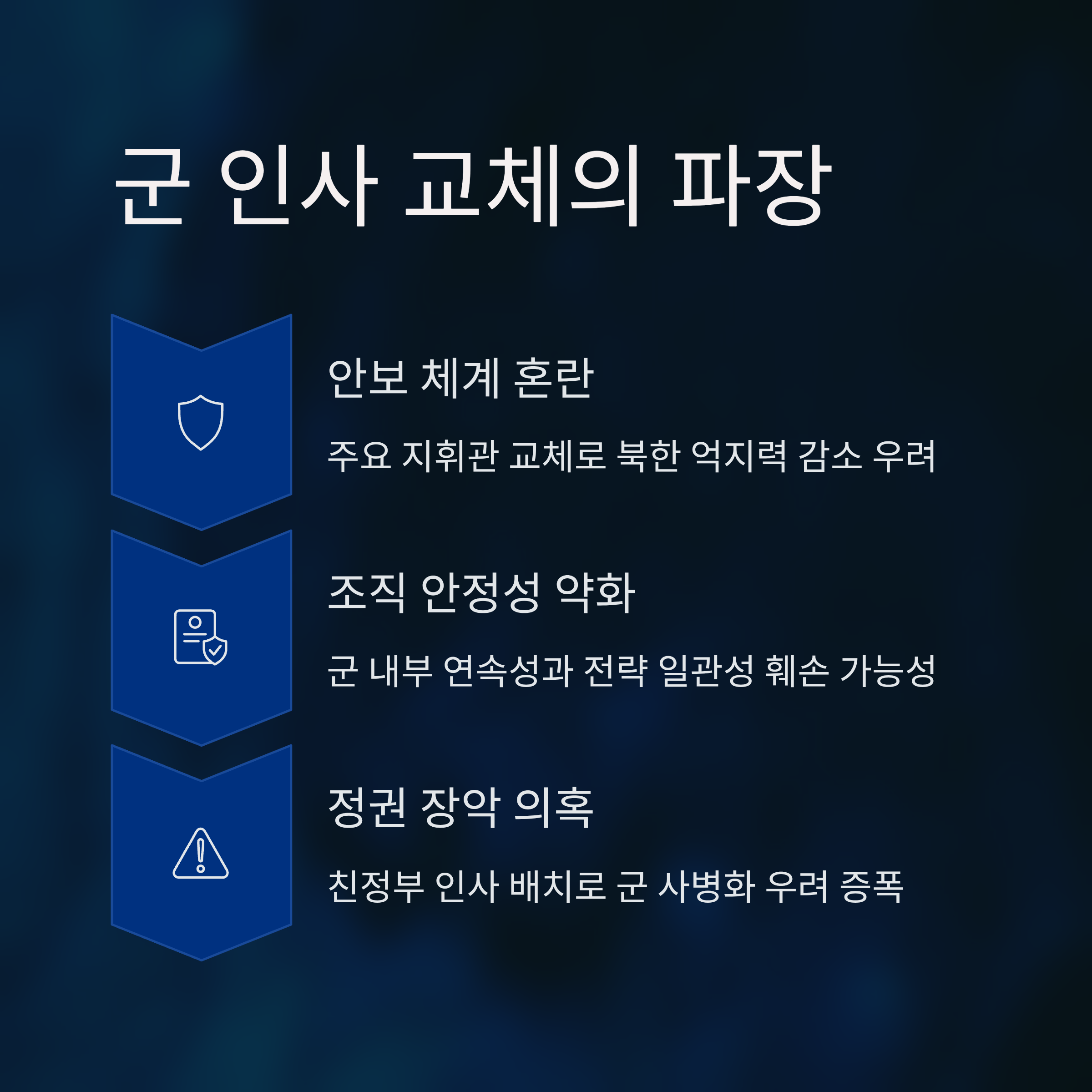 한편, 이러한 대대적 인사 개편이 국가 안보와 군사 전략의 연속성을 위협할 수 있으며 북한에 대한 억지력 감소를 초래할 수 있다는 우려가 군 안팎에서 제기되고 있습니다. 특히 주요 지휘관 대부분의 교체가 진행되며 군 내 조직 안정성에 의구심을 더했습니다.