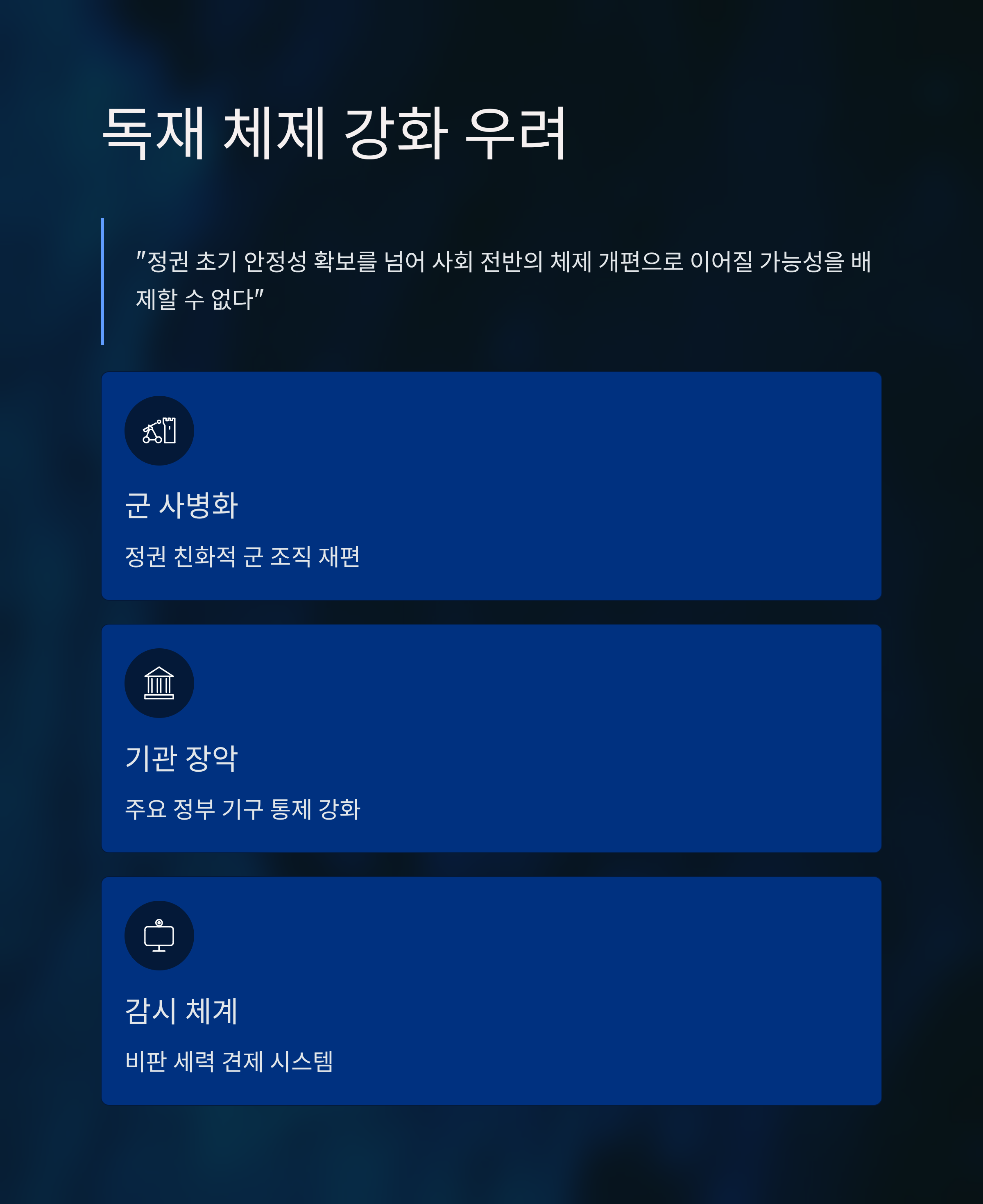 - 군 사병화 및 정권 장악을 위한 독재 체제 강화 의혹이 제기되고 있습니다.
