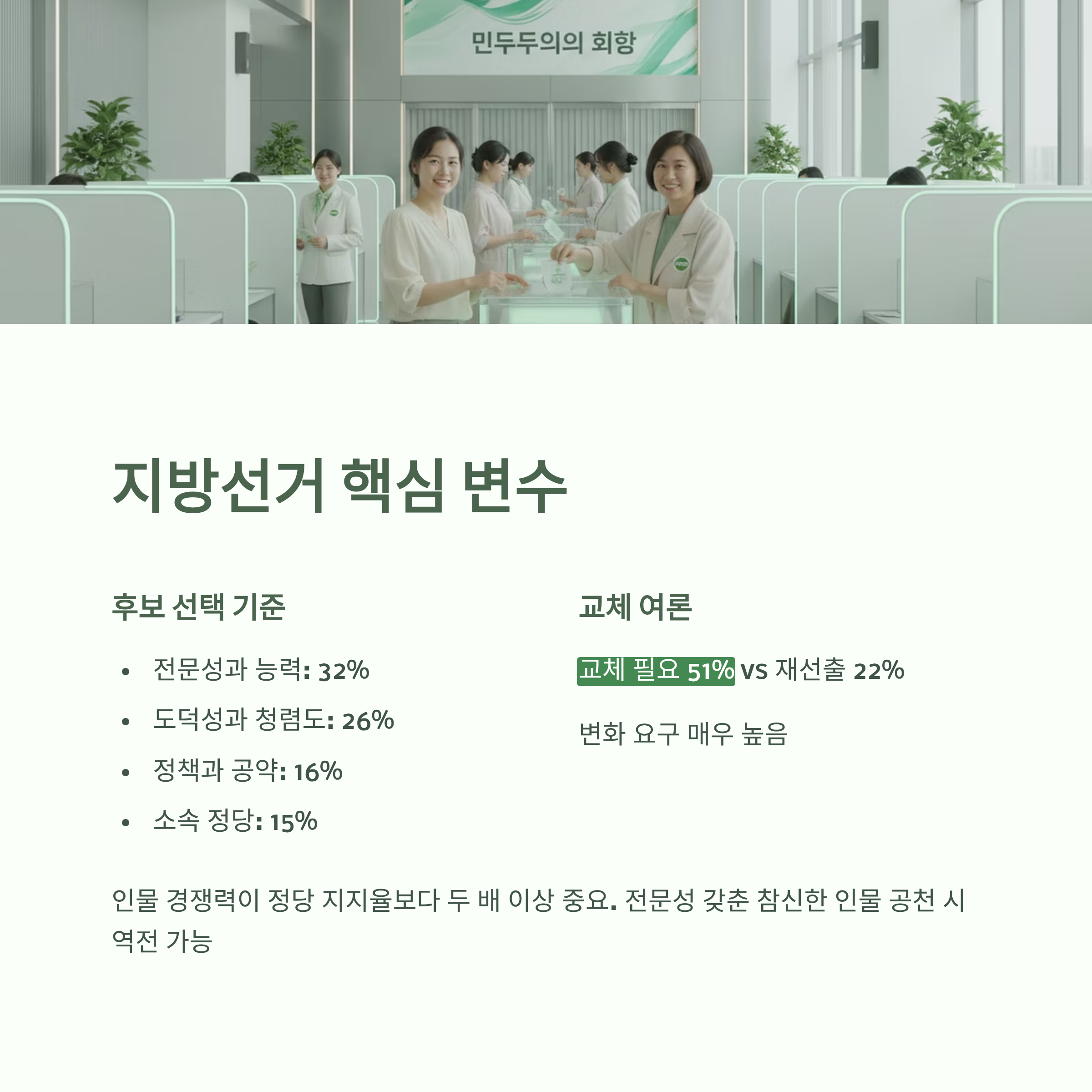 또한, 지방선거 후보 선택 기준으로 '전문성과 능력'(32%)이 '소속 정당'(15%)보다 두 배 이상 높게 나타난 점도 주목해야 합니다. 이는 유권자들이 정당만 보고 투표하는 것이 아니라, 인물의 경쟁력을 중요한 판단 기준으로 삼고 있음을 보여줍니다. 따라서 국민의힘이 전문성과 능력을 갖춘 참신한 인물을 공천한다면, 정당 지지율의 열세나 불리한 선거 전망을 충분히 뒤집고 승리할 가능성이 열려 있습니다. 이번 지방선거는 인물 경쟁력이 최대 변수가 될 것입니다.