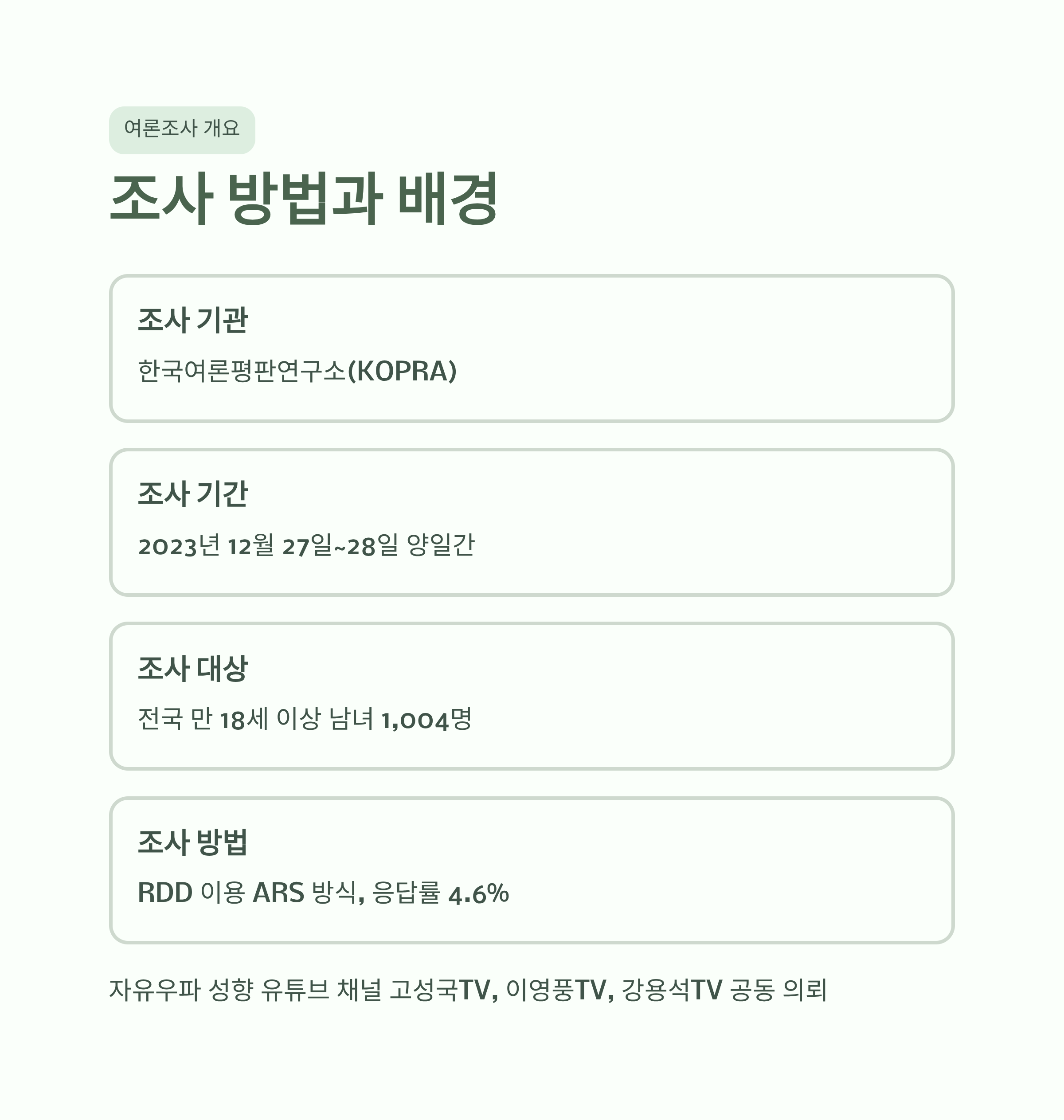 새해를 맞아 자유우파 성향의 유튜브 채널인 고성국TV, 이영풍TV, 강용석TV가 공동으로 한국여론평판연구소(KOPRA)에 의뢰한 차기 대선 후보 지지도 여론조사 결과가 발표되었습니다. 2023년 12월 27일부터 28일까지 양일간 전국 만 18세 이상 남녀 1,004명을 대상으로 실시된 이번 조사는 RDD를 이용한 ARS 방식으로 진행되었으며, 응답률은 4.6%입니다.