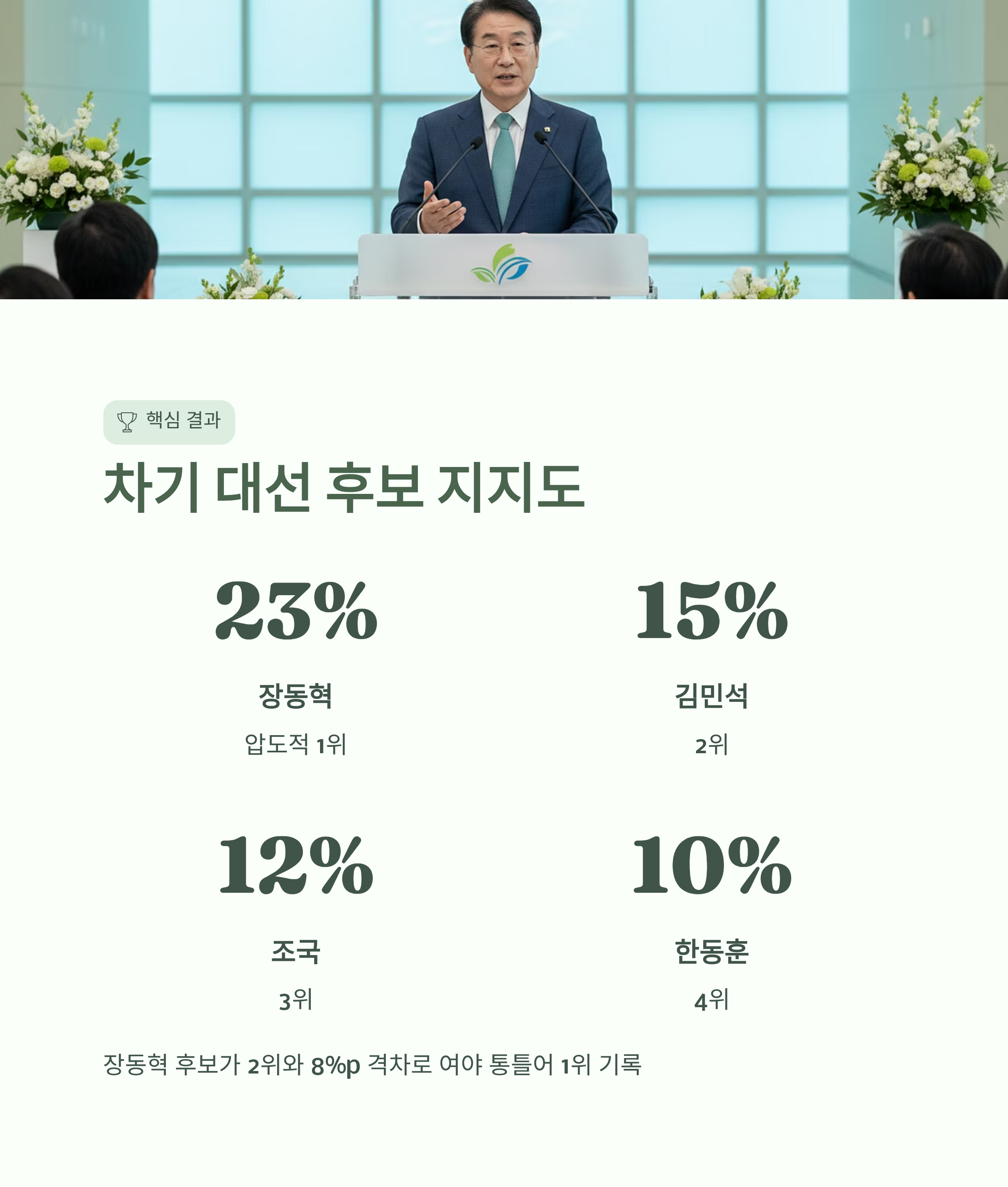 | A. 장동혁 후보가 23%의 지지율을 기록하며 1위에 올랐습니다. 이는 2위 김민석 후보(15%), 3위 조국 후보(12%)를 상당한 격차로 앞선 수치입니다. |