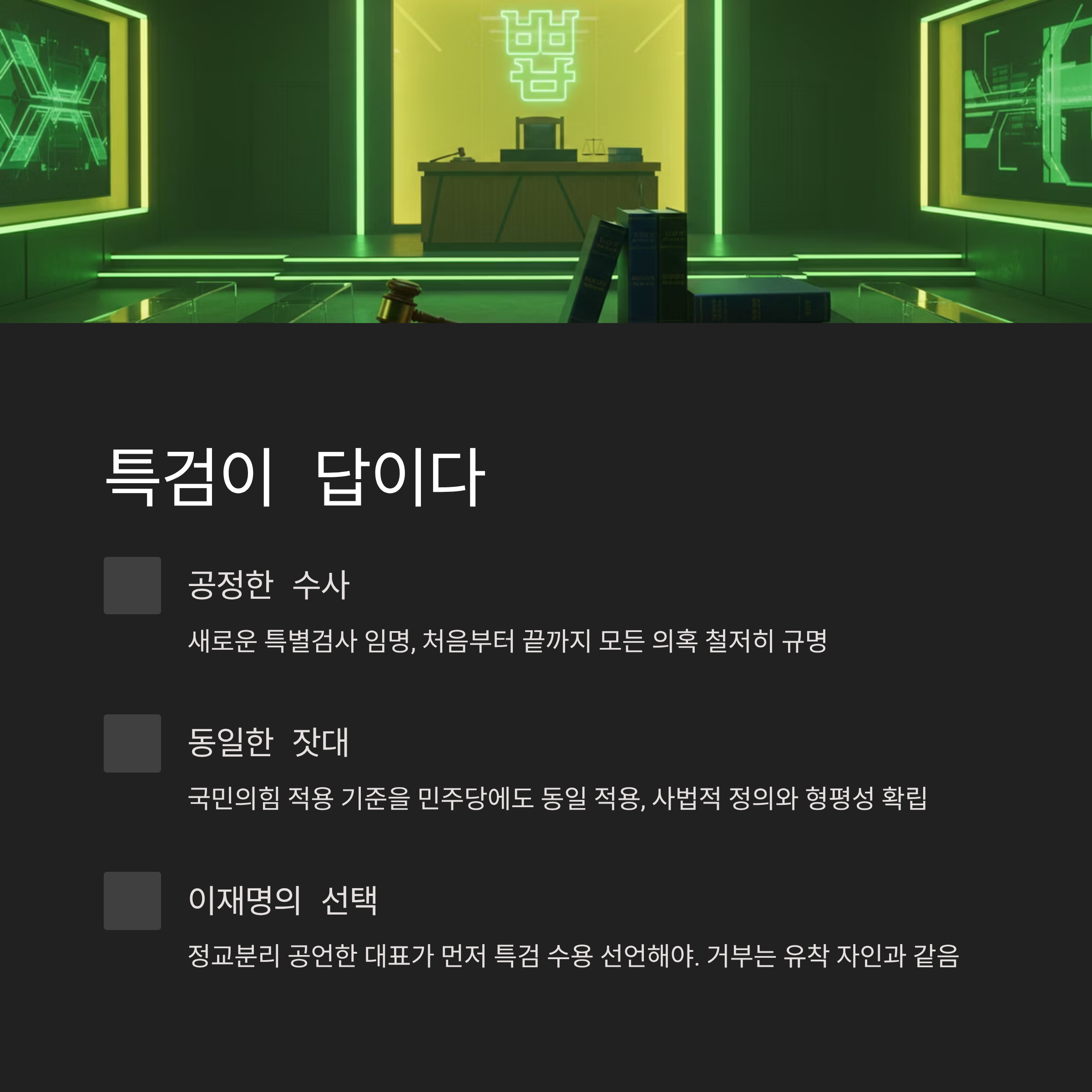 이는 국민의힘에 적용되었던 엄격한 수사 기준을 민주당에도 동일하게 적용하여 사법적 정의와 형평성을 바로 세우는 길이기도 합니다.