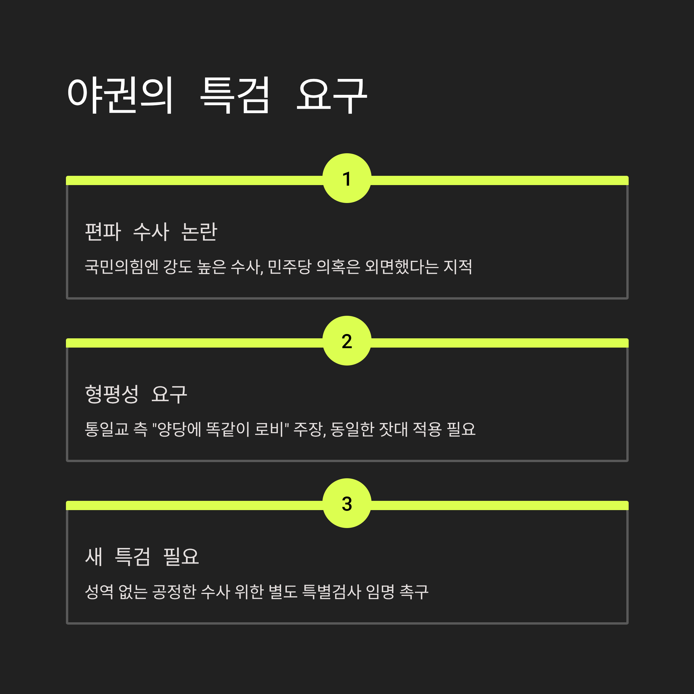 정동영 전 장관의 시인과 전재수 장관의 사퇴를 계기로, 국민의힘과 개혁신당 등 야권은 '민주당-통일교 유착 의혹'을 규명하기 위한 별도의 특별검사제(특검) 도입을 공식적으로 요구하고 나섰습니다.