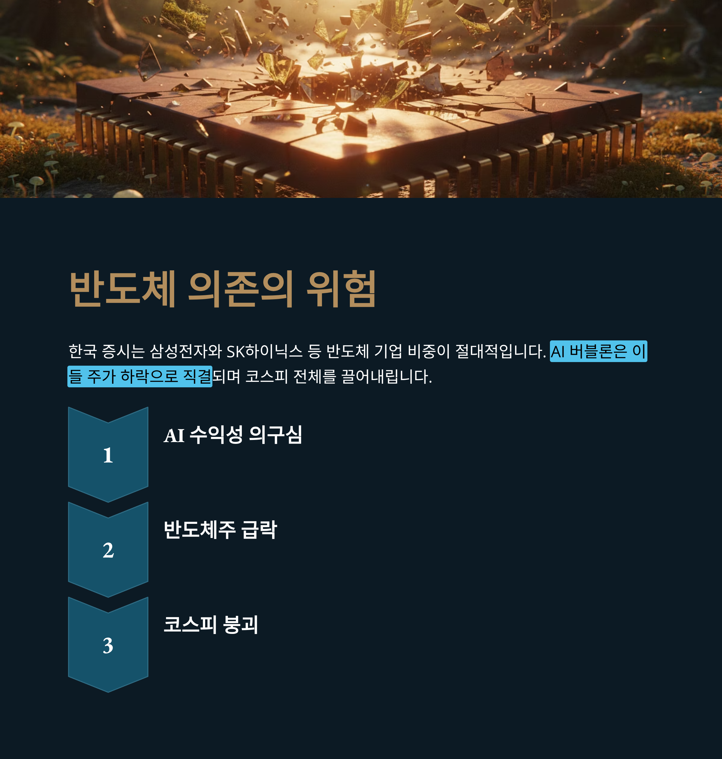 | 한국 증시는 삼성전자와 SK하이닉스 등 반도체 기업의 비중이 절대적입니다. 미국발 AI 산업 수익성에 대한 의구심(버블론)은 이들 기업의 주가 하락으로 직결되며, 결과적으로 코스피 지수 전체를 끌어내리는 핵심 요인으로 작용하고 있습니다. |
