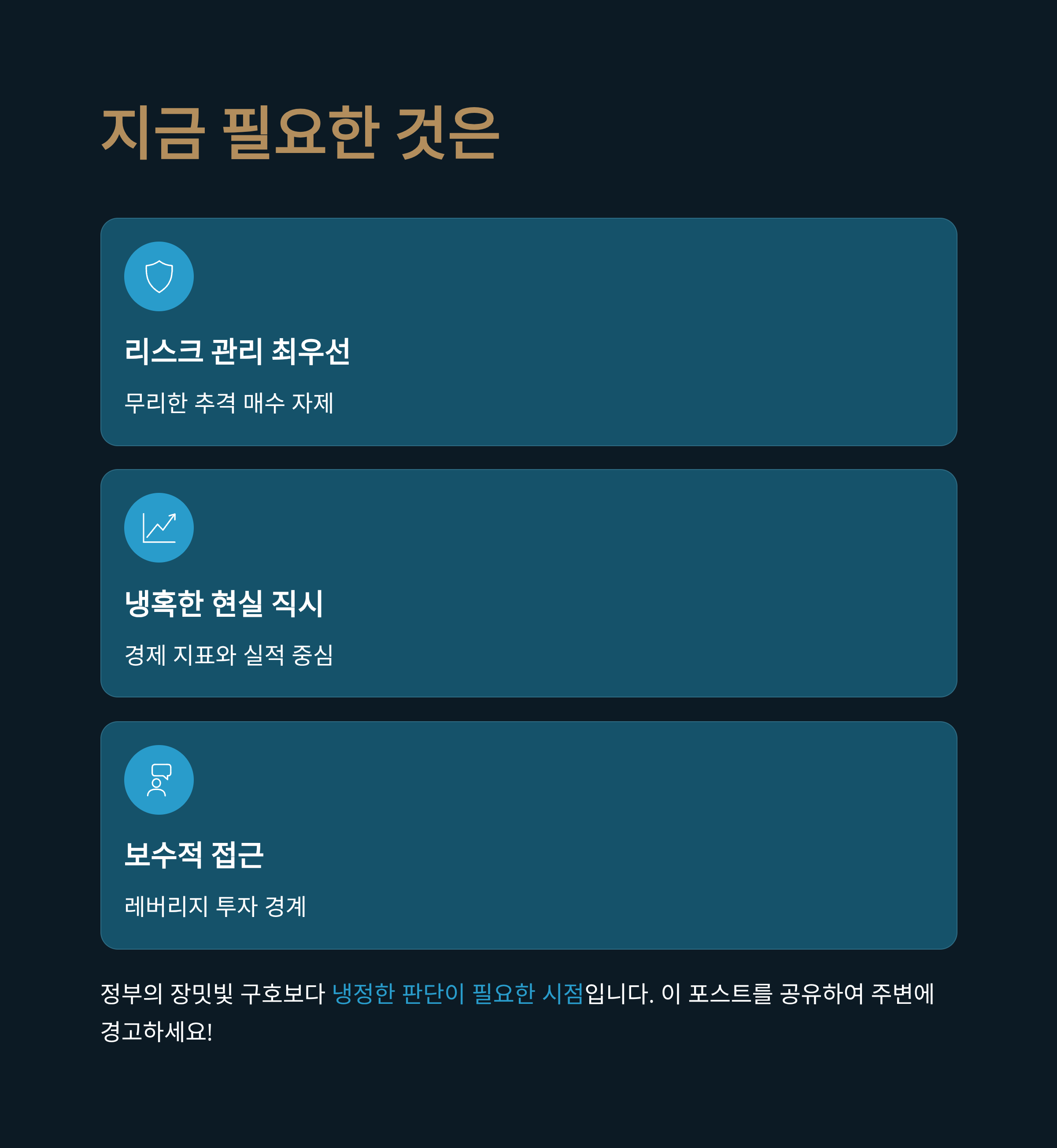 무리한 추격 매수보다는 리스크 관리에 최우선을 두는 보수적인 접근이 그 어느 때보다 절실한 시점입니다.