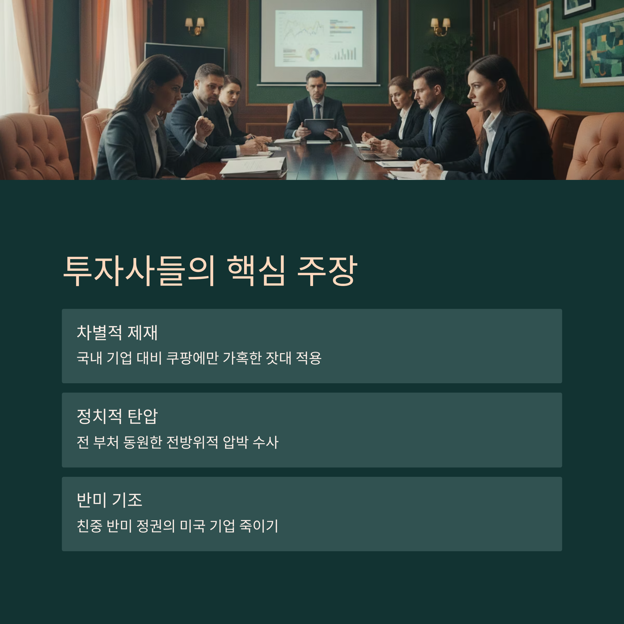 만약 USTR이 이 문건을 근거로 조사를 개시한다면, 사태는 단순한 기업 소송을 넘어 통상 보복으로 이어질 수 있습니다. 트럼프 대통령은 자국 기업이 해외에서 부당한 대우를 받는 것에 대해 관세 폭탄 등 강력한 보복 조치를 취하는 성향이 강하기 때문입니다. 투자사들은 이러한 미국의 정치적 상황을 십분 활용하여, 한국 정부가 쿠팡에 가하는 압박을 '미국 자본에 대한 공격'으로 프레임화하고 있습니다.