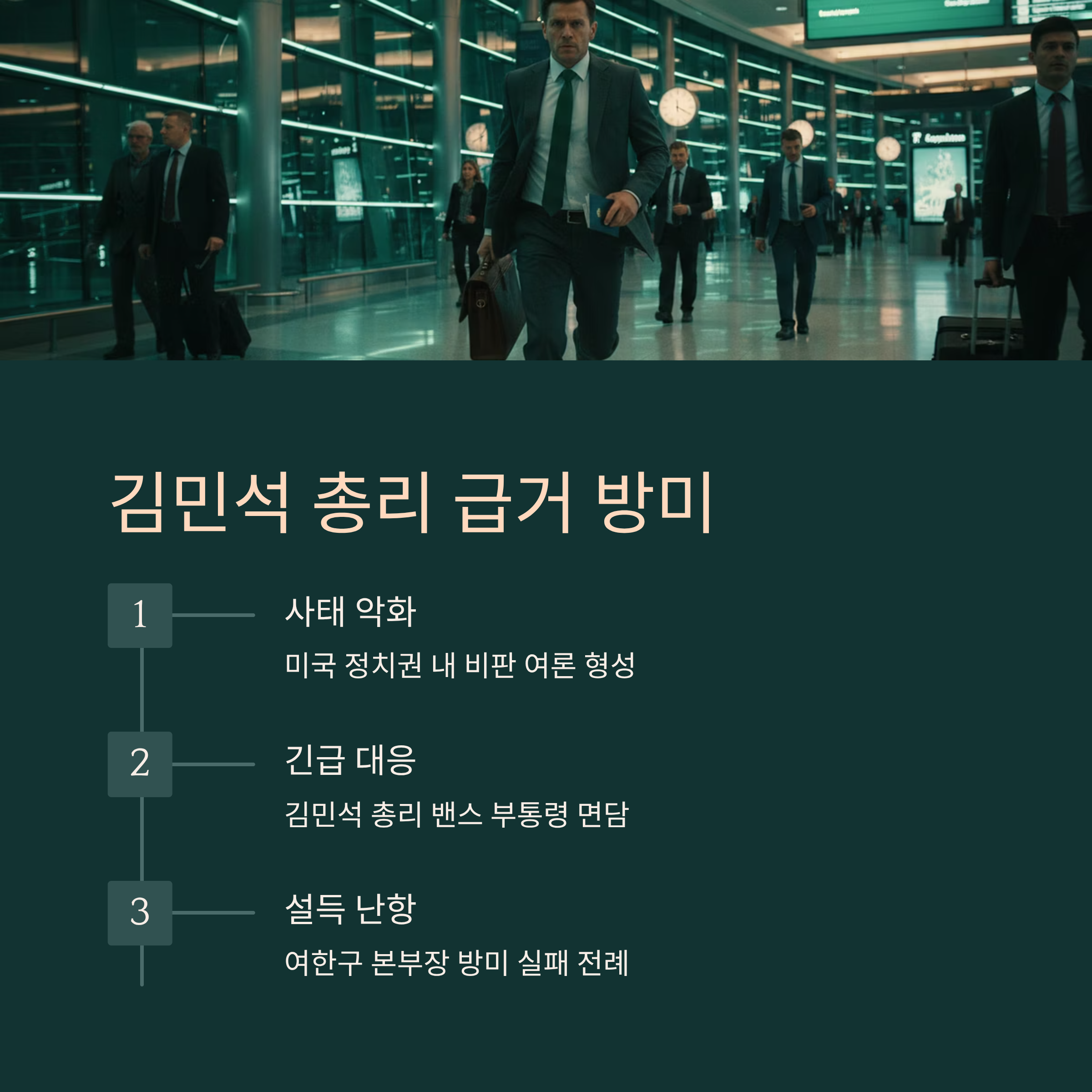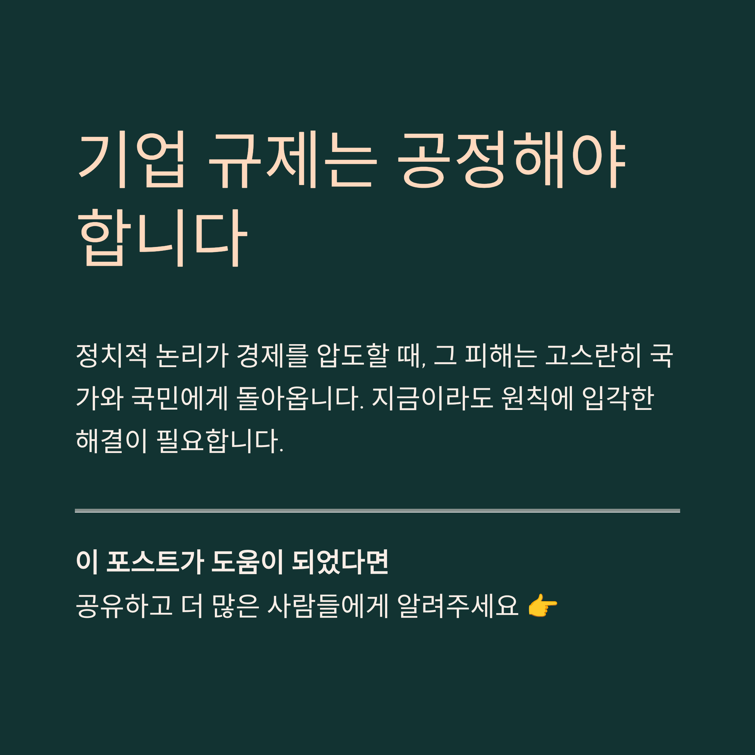 정부는 지금이라도 감정적인 대응을 멈추고, 국제적인 스탠다드와 법리적 원칙에 입각하여 문제를 해결해야 합니다. 김민석 총리의 방미가 단순한 '보여주기식' 행보에 그쳐서는 안 되며, 미국 투자자들과 정부를 설득할 수 있는 실질적인 논리와 대안을 제시해야 합니다. 기업 규제는 공정해야 하며, 정치적 논리가 경제를 압도할 때 그 피해는 고스란히 국가와 국민에게 돌아간다는 사실을 명심해야 할 것입니다.