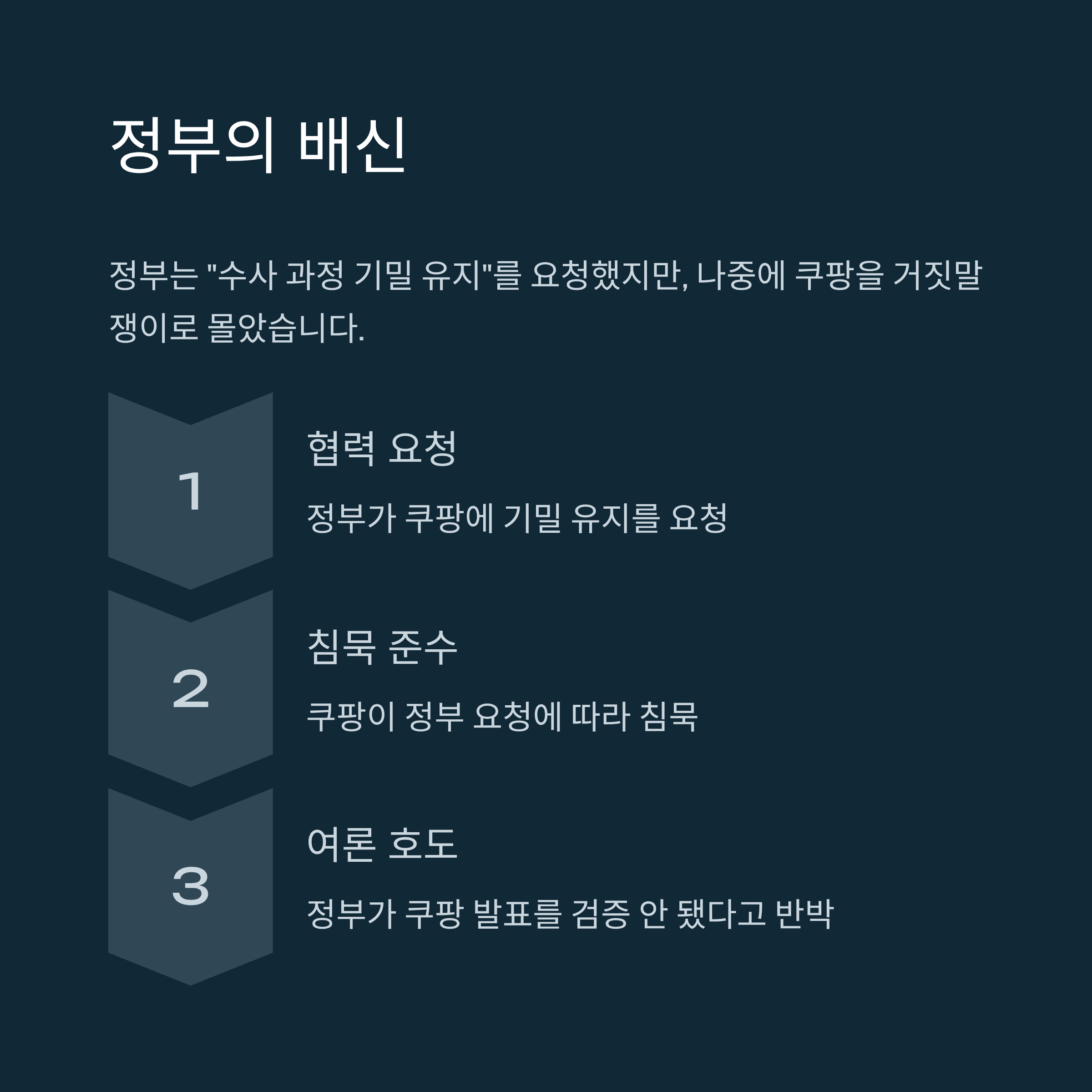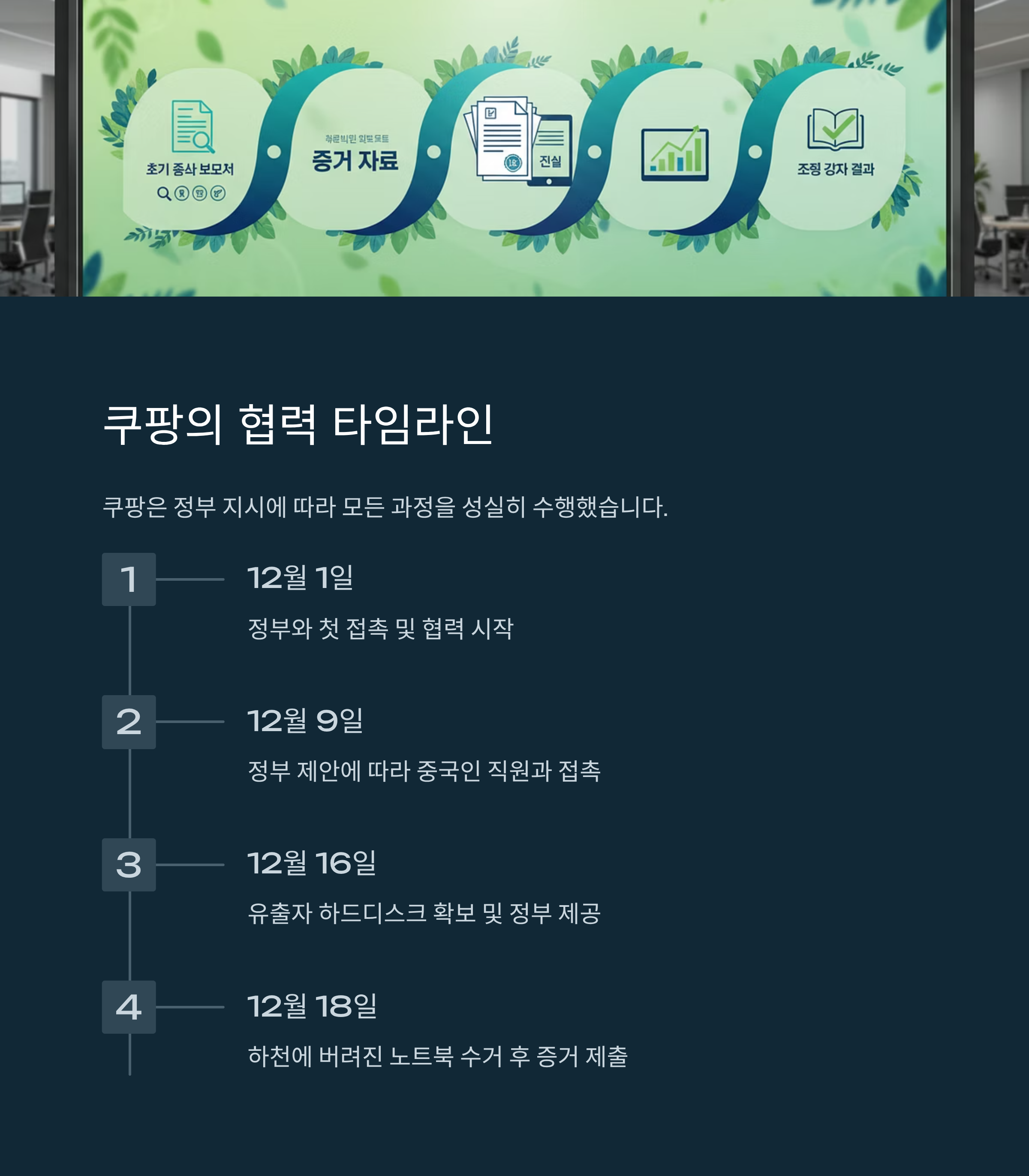 쿠팡이 공개한 타임라인을 보면, 정부의 발표와 달리 쿠팡은 사건 초기부터 정부와 완벽에 가깝게 공조했습니다. 12월 1일 정부와 접촉 후, 9일에는 정부 제안에 따라 중국인 직원과 접촉했고, 16일에는 정부 지시하에 유출자의 하드디스크를 확보해 제공했습니다. 심지어 18일에는 하천에 버려진 노트북을 수거하여 정부에 증거로 제출하기까지 했습니다. 이 모든 과정에서 정부는 "수사 과정 기밀 유지"를 요청했고, 쿠팡은 이에 따라 침묵을 지켰습니다.