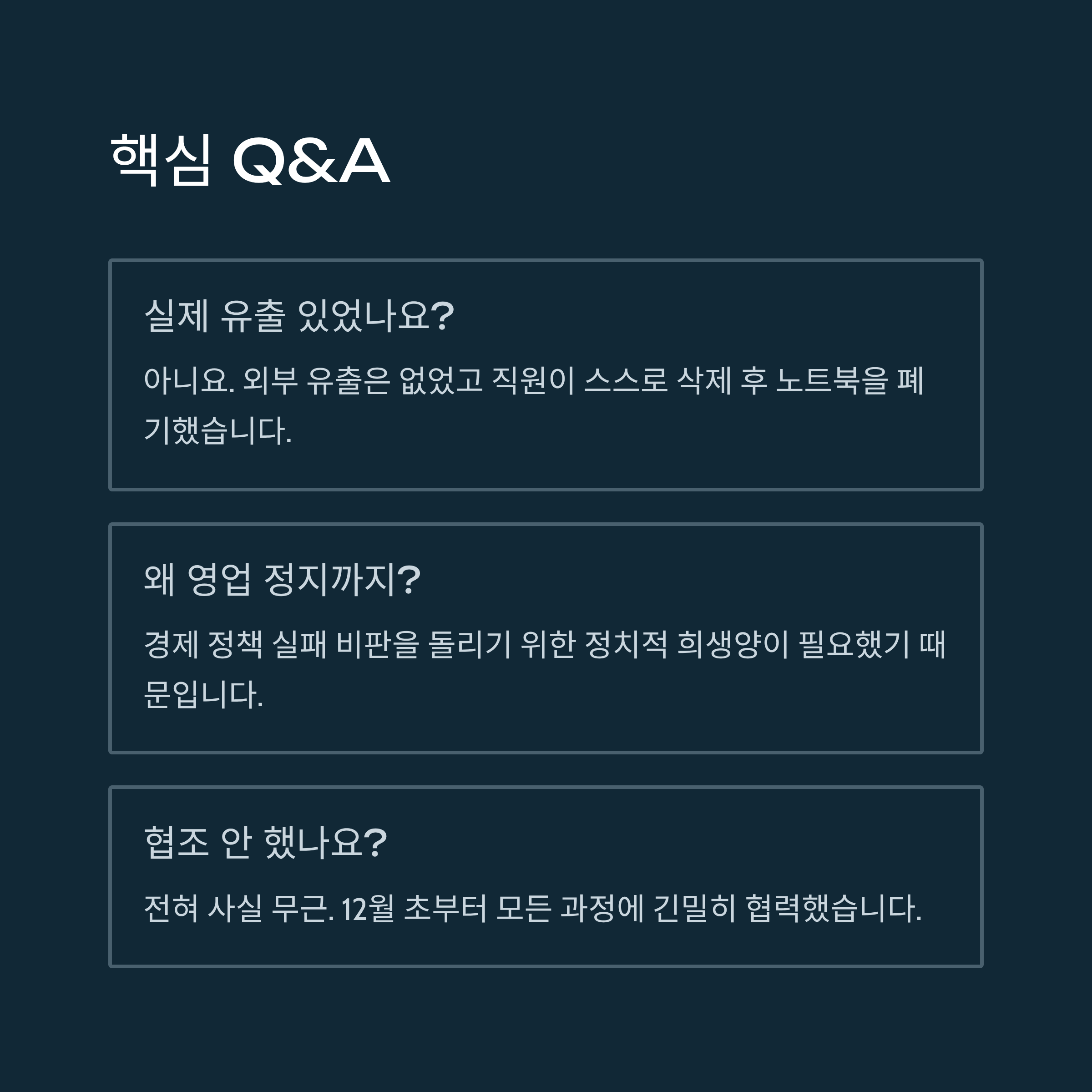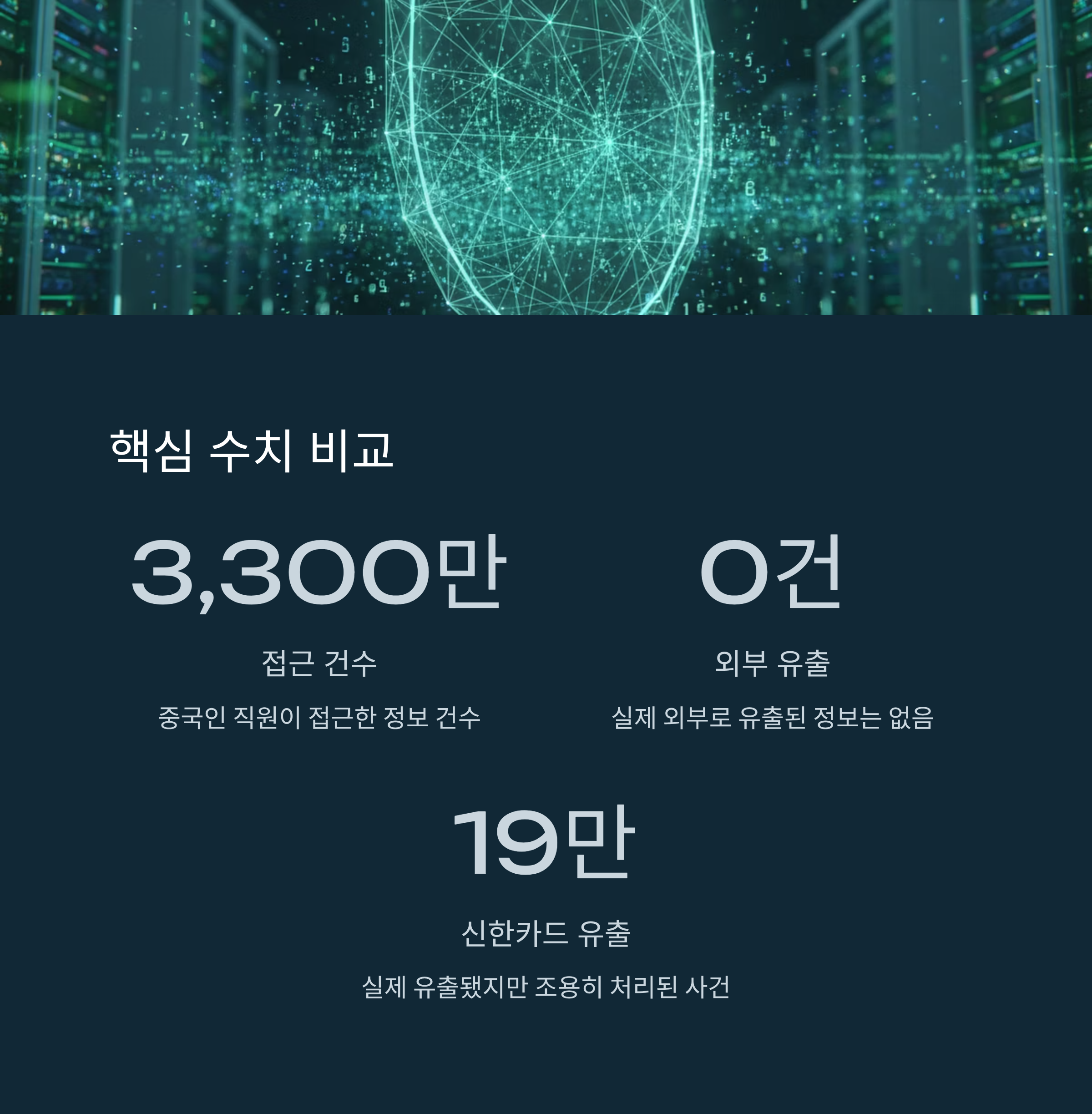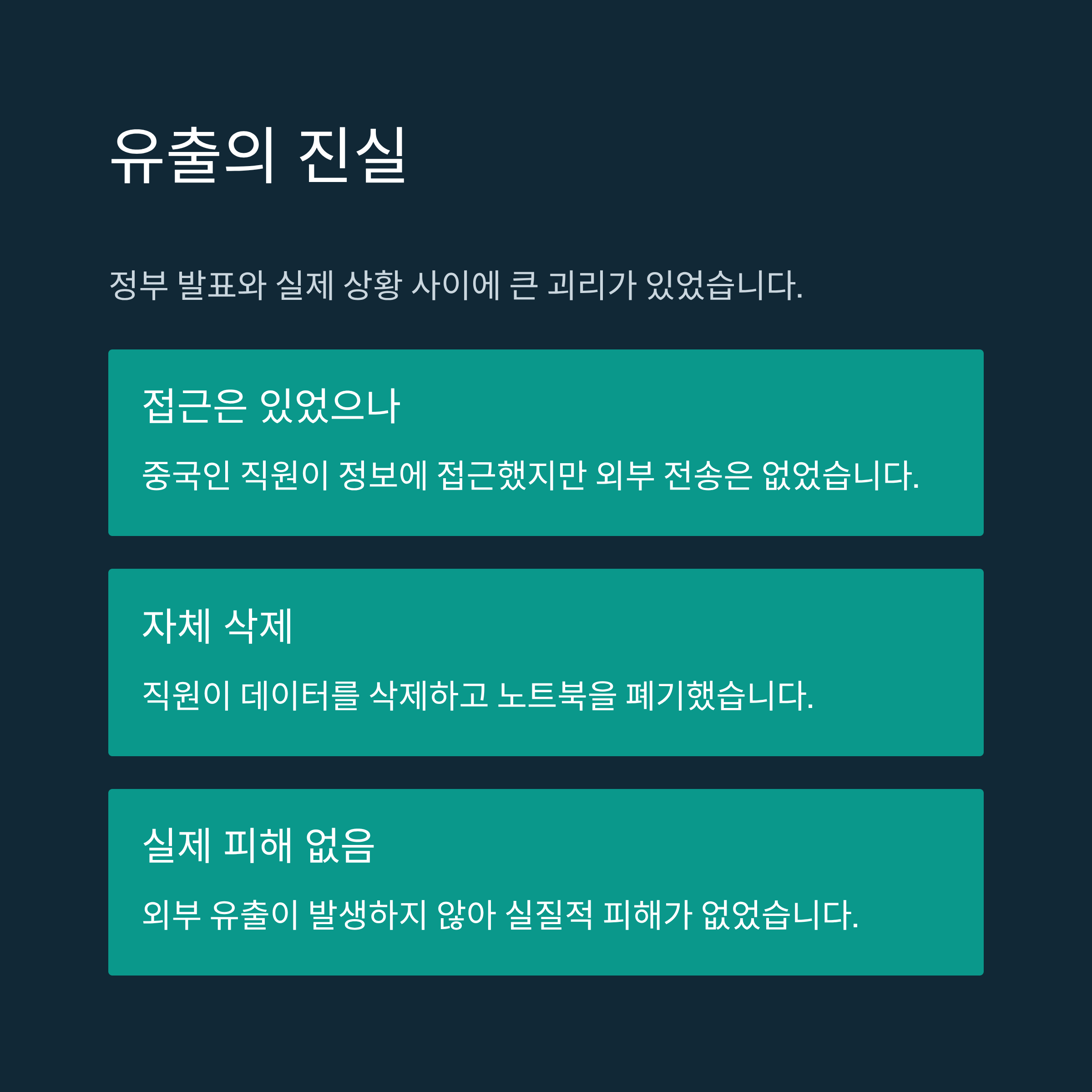 - 유출 진실: 중국인 직원이 정보에 접근했으나, 외부 전송은 없었고 직원이 자체적으로 데이터를 삭제 후 노트북을 폐기했습니다.