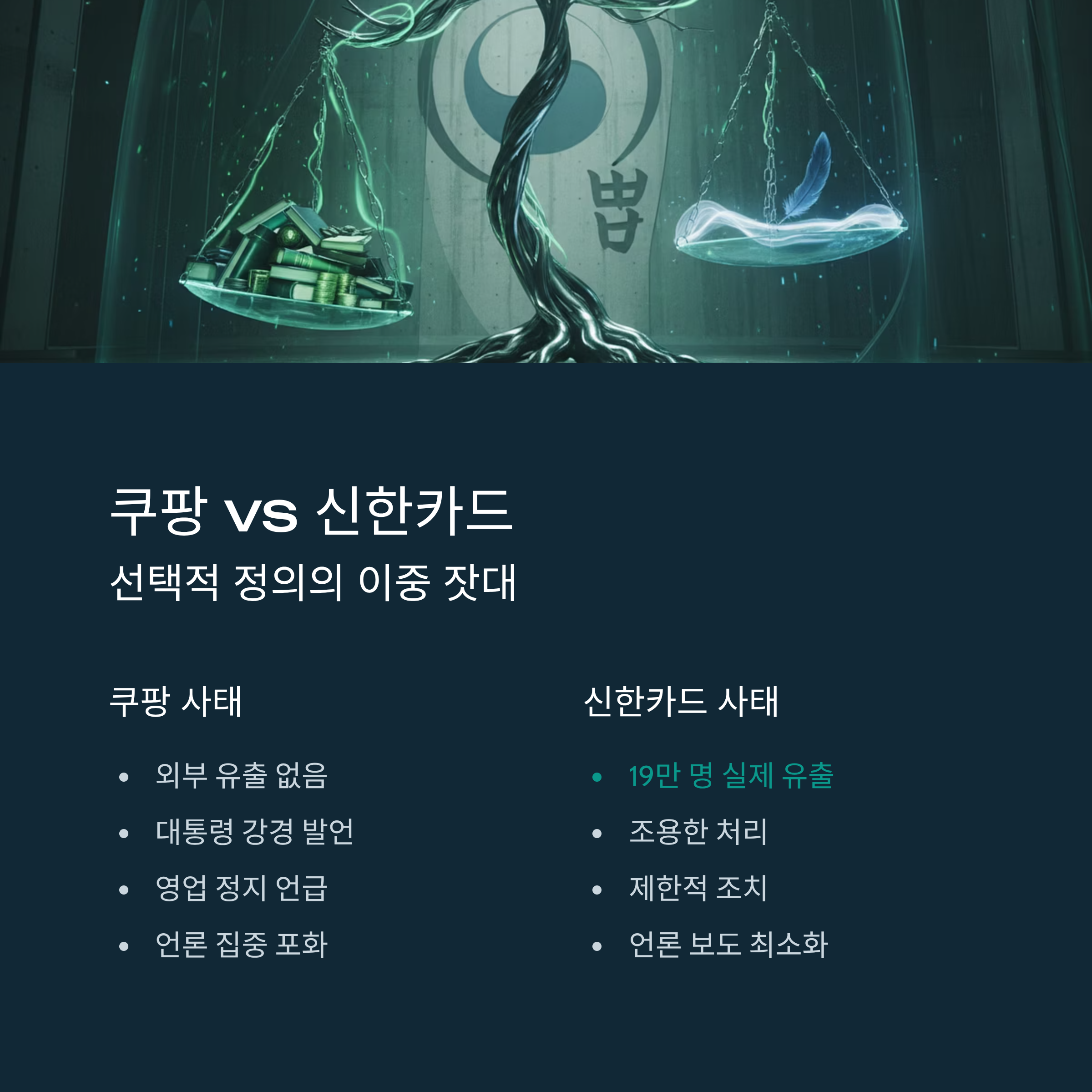 - 선택적 정의: 실제 19만 건 정보가 유출된 신한카드 사태는 조용히 넘어간 반면, 외부 유출이 없었던 쿠팡만 집중 공격받는 이중 잣대가 드러났습니다.