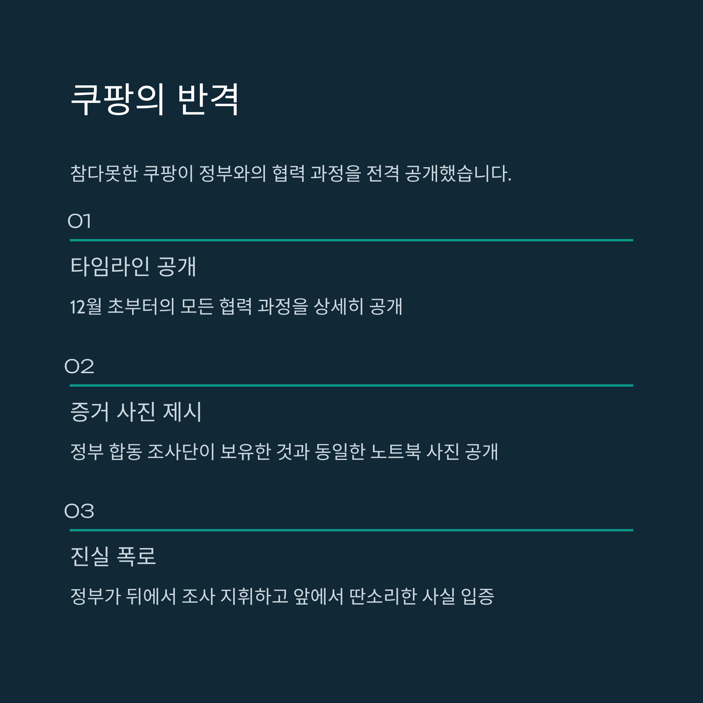 - 쿠팡의 반격: 정부가 쿠팡의 해명을 "검증되지 않은 주장"이라고 반박하자, 쿠팡은 정부와 함께 조사한 타임라인과 증거 사진을 공개하며 정면 돌파했습니다.
